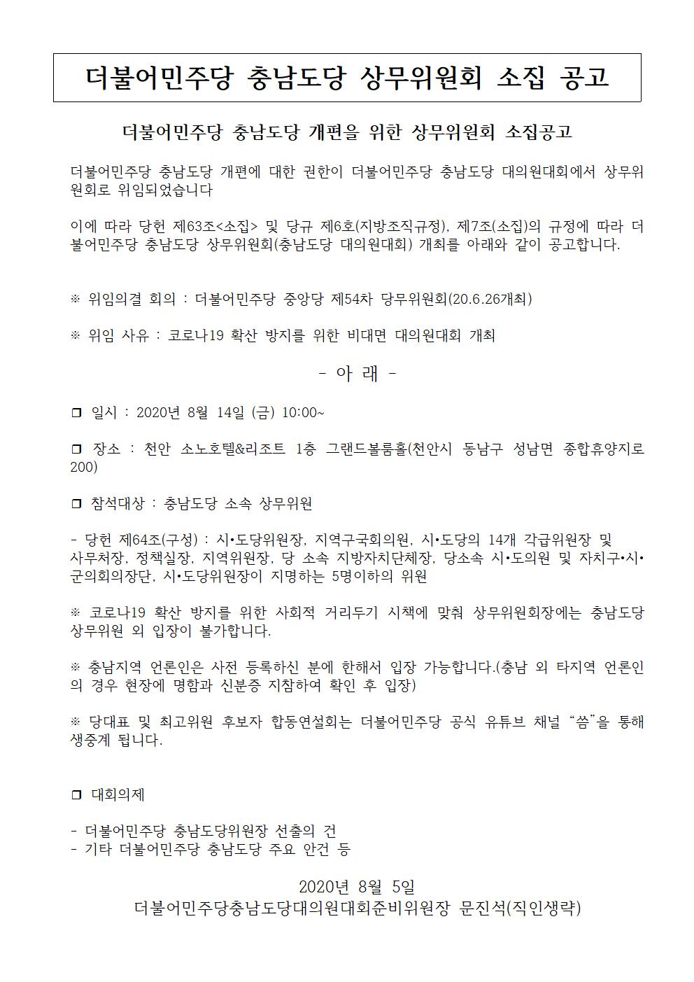 더불어민주당 충청남도당 상무위원회 소집 공고