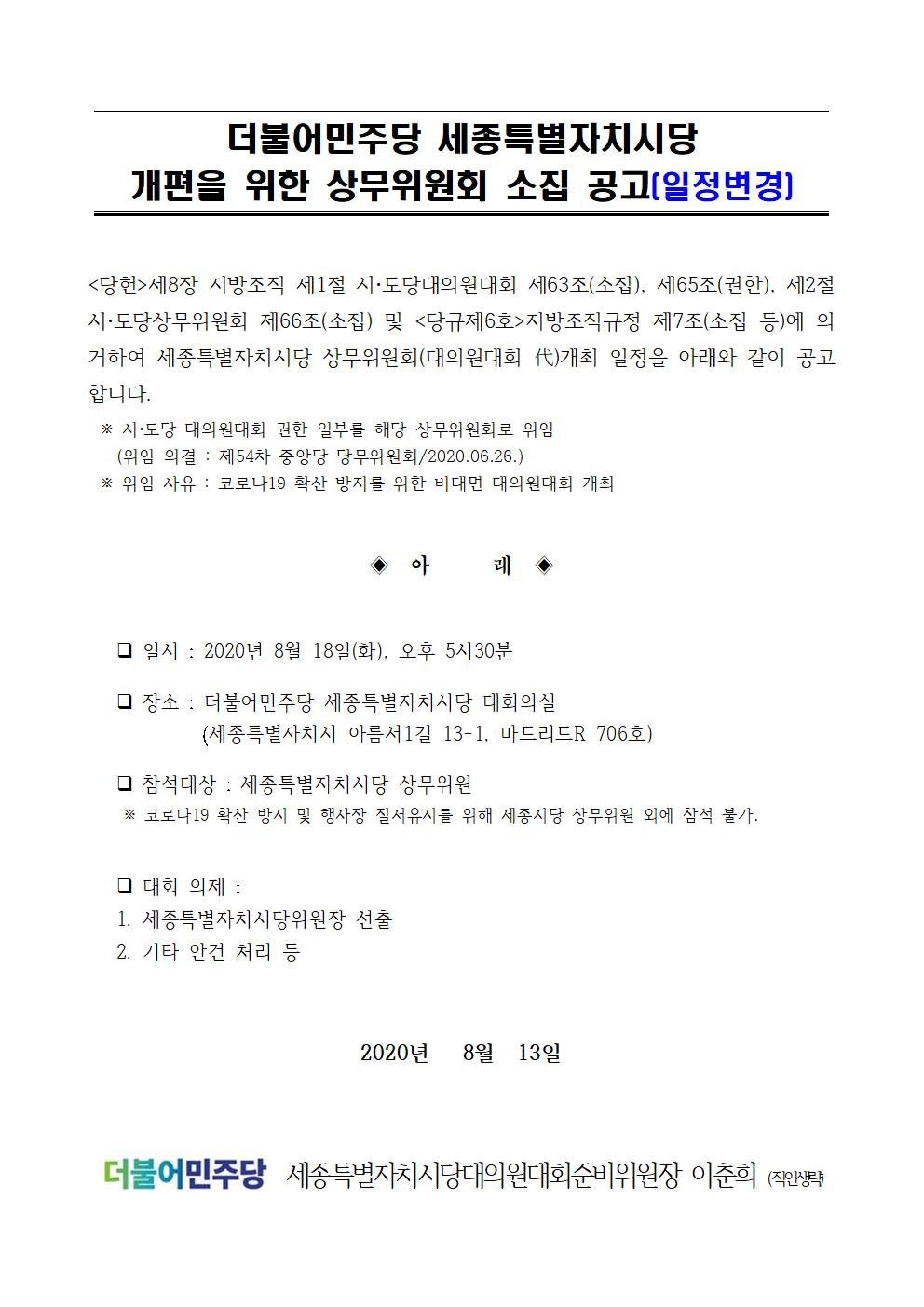 더불어민주당 세종특별자치시당 개편을 위한 상무위원회 소집 공고