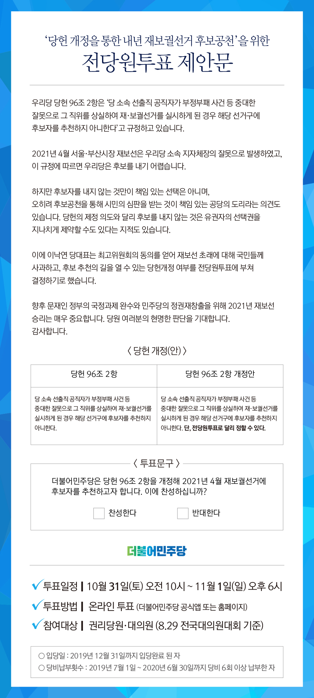 '당헌 개정을 통한 내년 재보궐선거 후보공천'을 위한 전당원투표 제안문