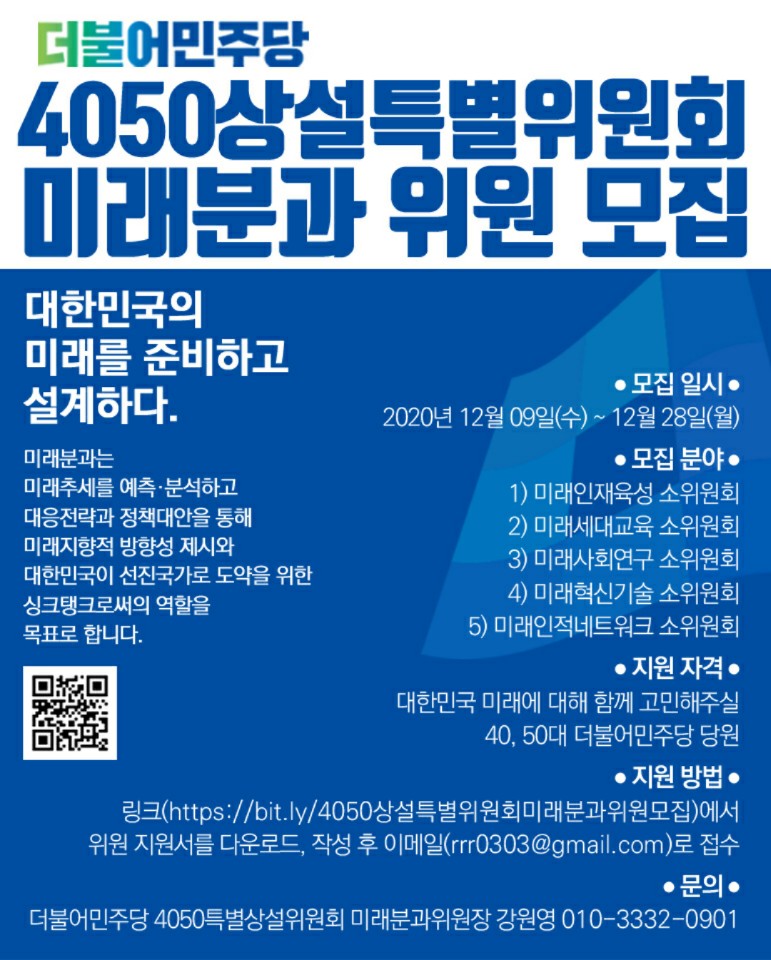 - 문의 : 더불어민주당 4050특별상설위원회 미래분과 위원장 강원영 010-3332-0901