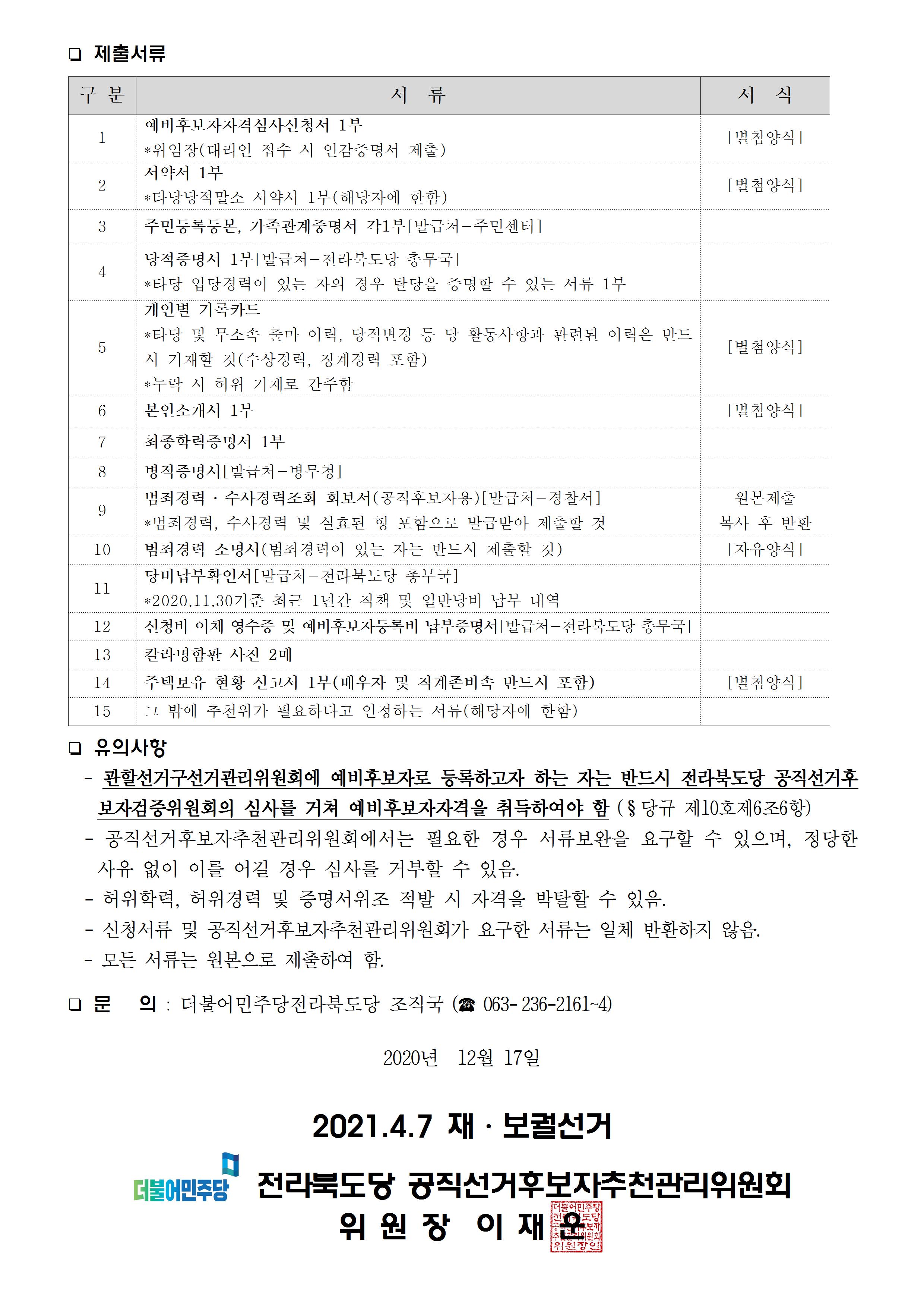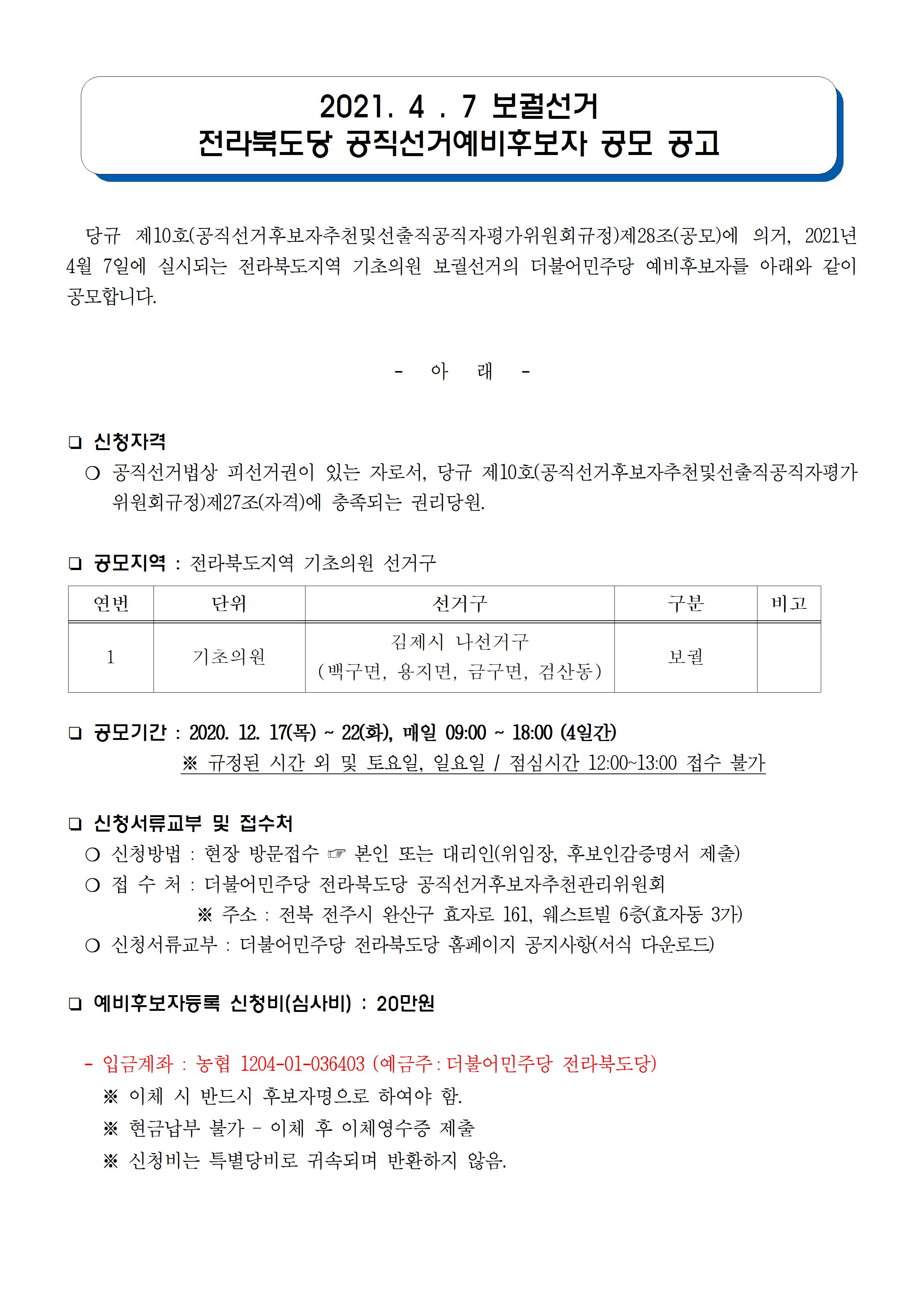 2021.4.7 보궐선거 전라북도당 공직선거예비후보자 공모 공고