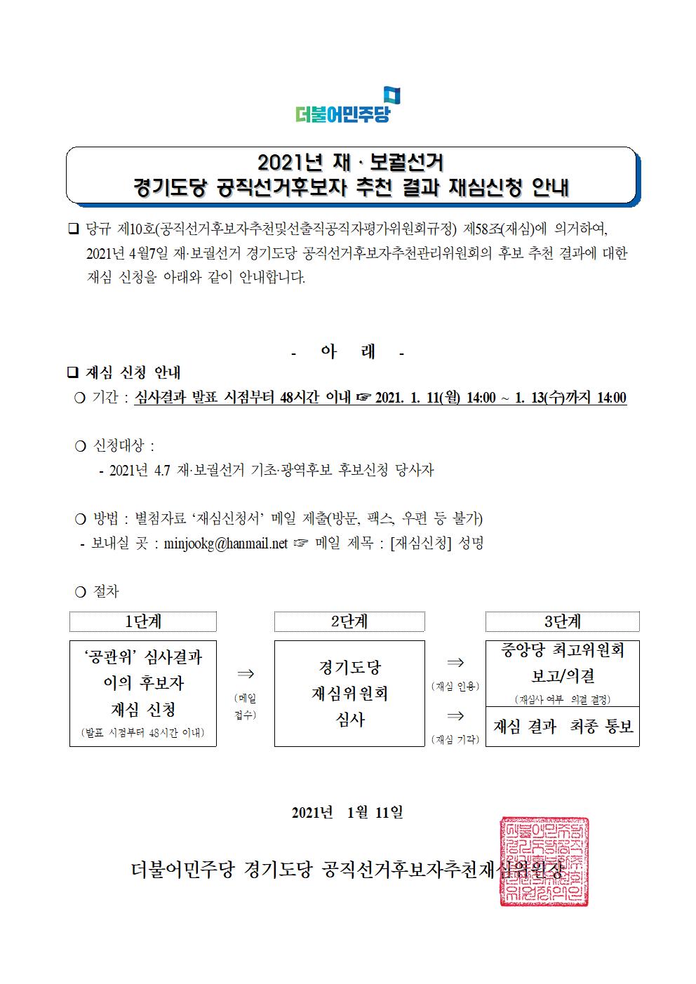 2021년 재·보궐선거 경기도당 공직선거후보자 추천 결과 재심신청 안내