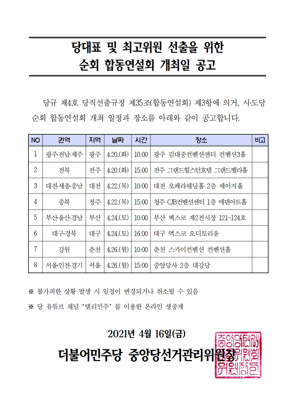 당대표 및 최고위원 후보자 순회합동연설회 공고(5.2.10:44 수정)