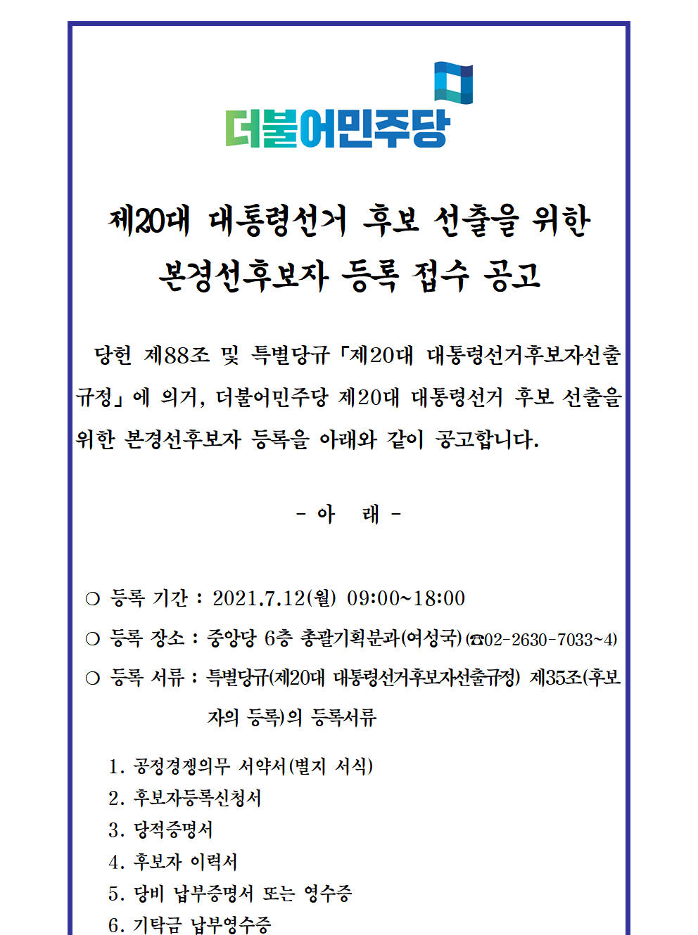제20대 대통령선거 후보 선출을 위한 본경선후보자 등록 접수 공고