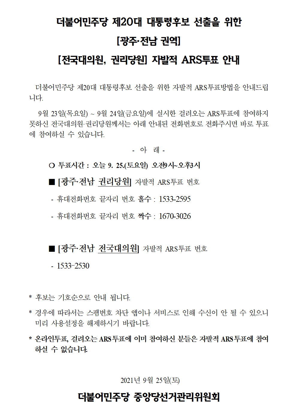 더불어민주당 제20대 대통령후보 선출을 위한 [광주·전남 권역] 자발적 ARS투표 안내