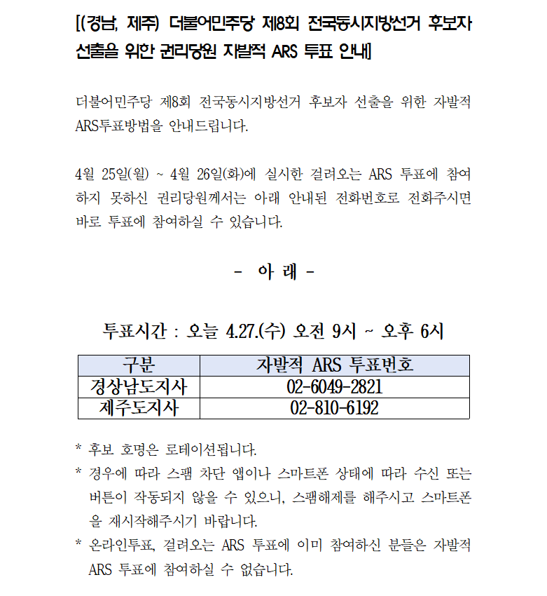 (경남, 제주) 더불어민주당 제8회 전국동시지방선거 후보자 선출을 위한 권리당원 자발적 ARS 투표 안내