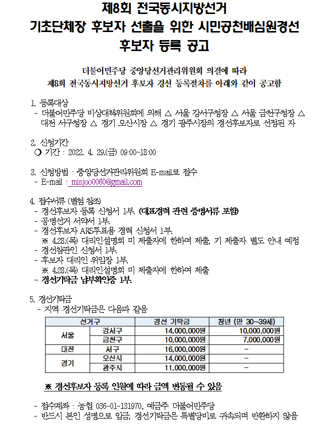 제8회 전국동시지방선거 기초단체장 후보자 선출을 위한 시민공천배심원경선 후보자 등록 공고