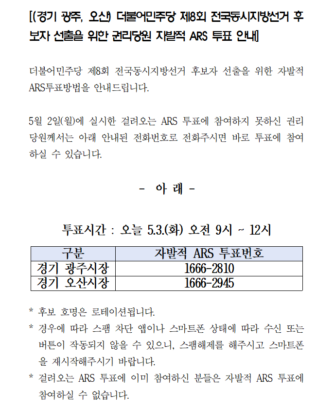 (경기 광주, 오산)더불어민주당 제8회 전국동시지방선거 후보자 선출을 위한 권리당원 자발적 ARS 투표 안내