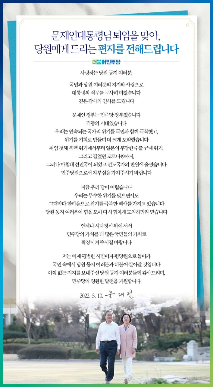 문재인 대통령님의 퇴임을 맞아, 당원에게 드리는 편지를 전해드립니다