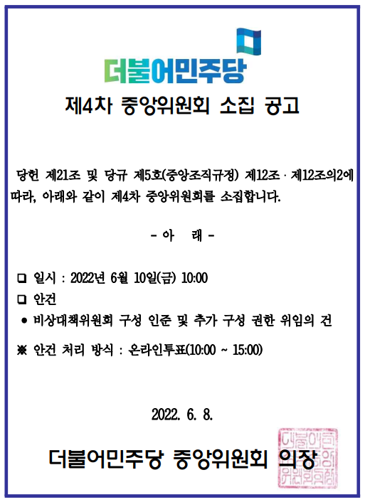 제4차 중앙위원회 소집 공고