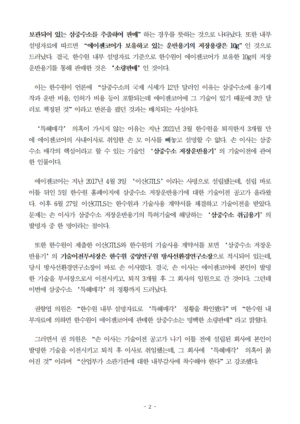 [국회의원 권향엽] 한수원 내부자료로 삼중수소 ‘특혜매각’ 정황 확인