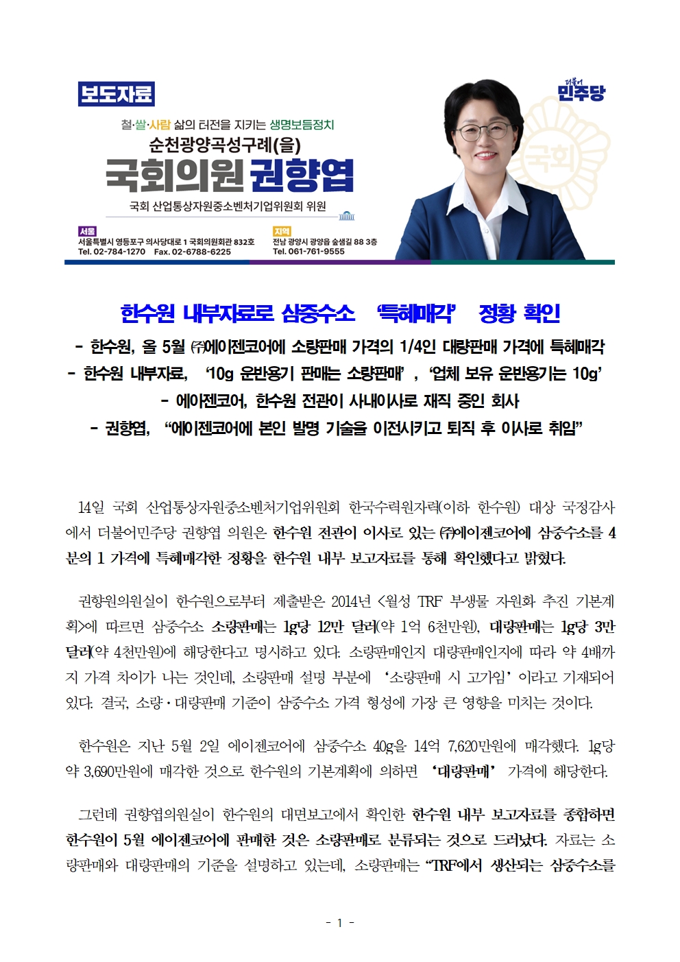 [권향엽 국회의원] 241014 보도자료_한수원 내부자료로 삼중수소 ‘특혜매각’ 정황 확인.hwp