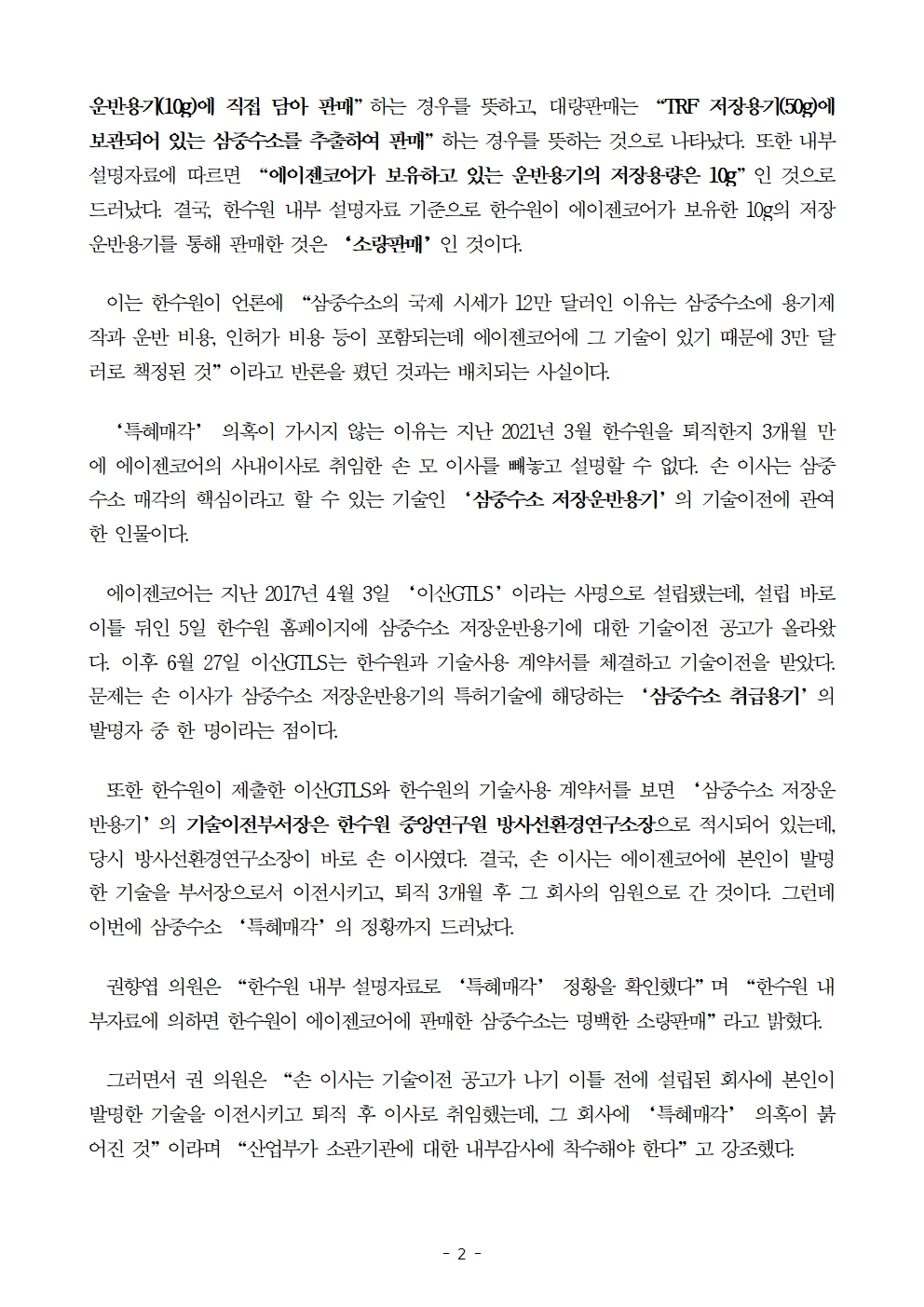 [국회의원 권향엽] 한수원 내부자료로 삼중수소 ‘특혜매각’ 정황 확인