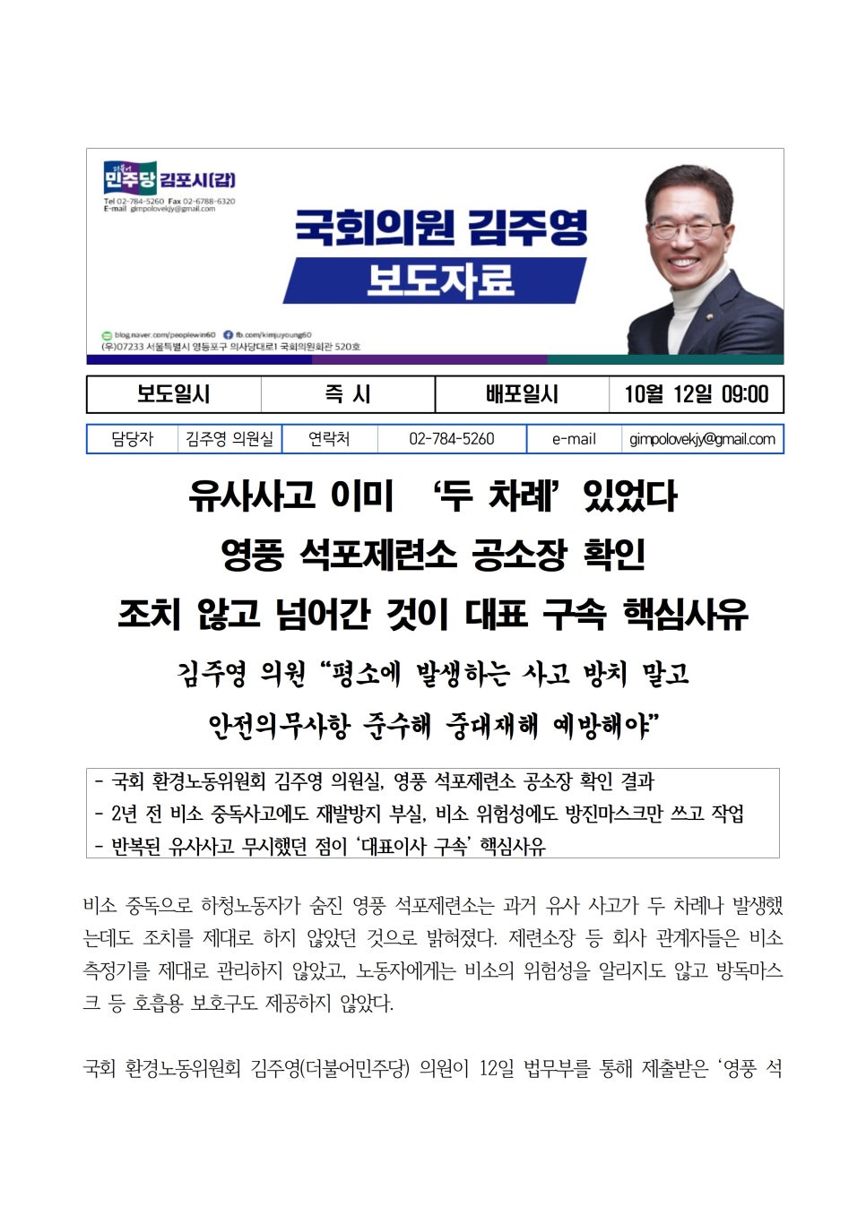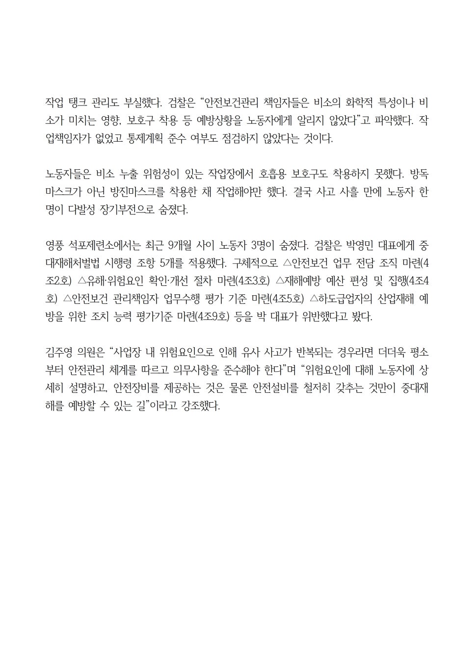 김주영 의원은 “아리셀의 화재참사는 안전관리 부실과 경영진의 무책임이 결합된 인재로, 경영책임자의 법적 책임을 엄중히 물어야 한다”며, “환노위 국정감사에서 사고 원인을 철저히 규명하고, 재발 방지를 위해 위험성평가 실효성 개선 등 제도 개선을 적극 추진할 것”이라고 강조했다.