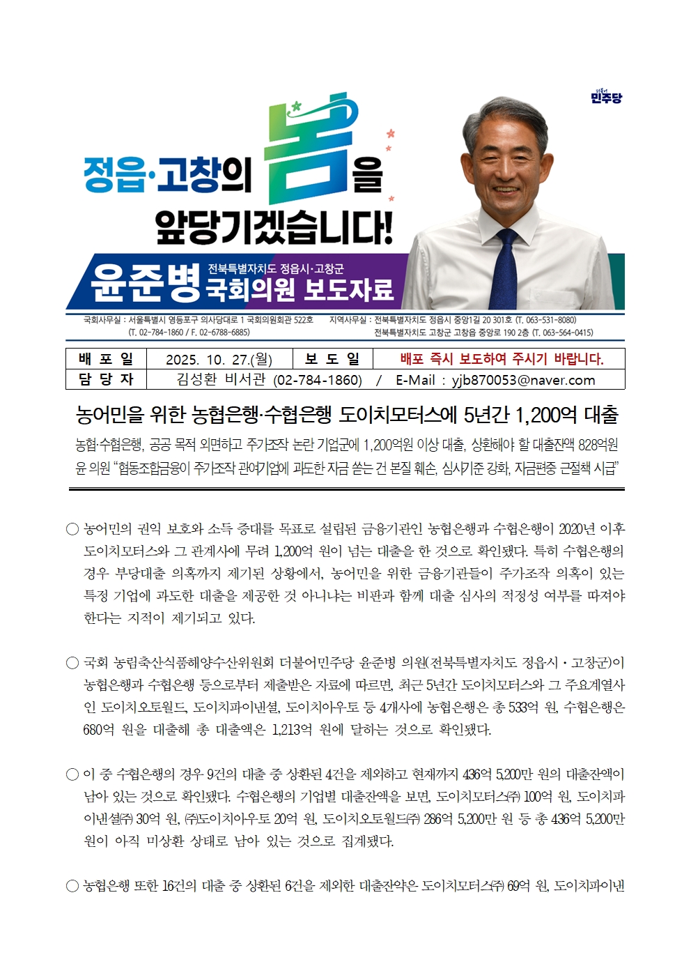 251027 [윤준병 의원 국정감사 보도자료] 농어민을 위한 농협은행·수협은행 도이치모터스에 5년간 1200억 대출.hwp