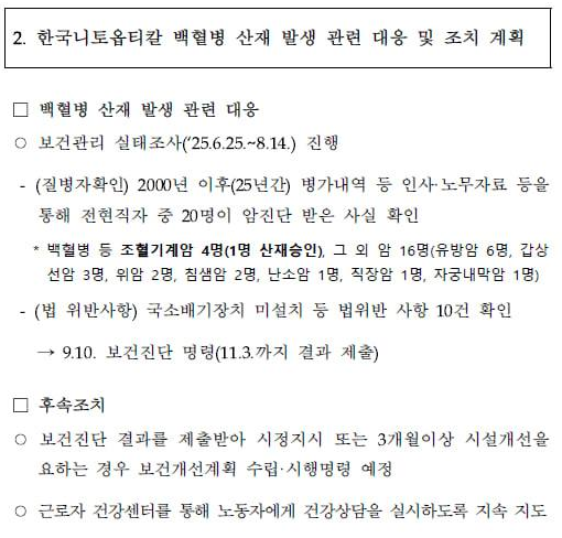 또 니토옵티칼의 2000년 이후 병가,인사‧노무내역 등을 확인한 결과 전‧혁지자 중 20명이 암 진단받은 사실도 확인됐다. 특히 기존 3명으로 알려졌던 조혈기계 암 환자가 1명 더 존재하는 것으로 드러났고, 유방암, 침샘암, 직장암 등 그 외 암 진단자도 다수 있었다.