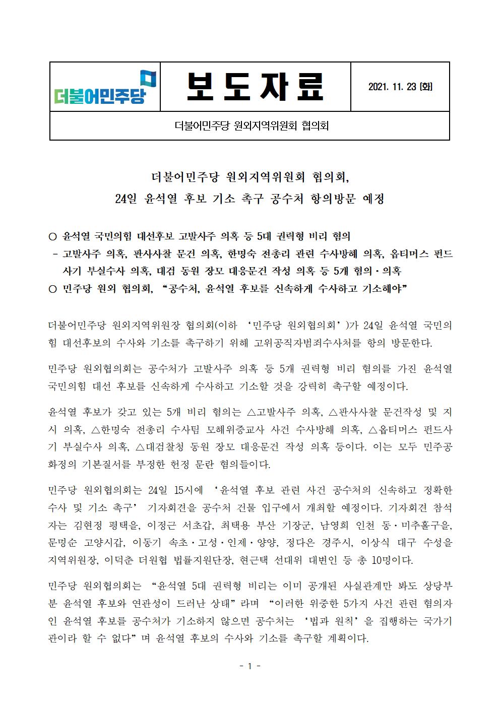 [보도자료] 더불어민주당 원외지역위원회 협의회 윤석열 후보 기소 촉구 공수처 항의방문 예정