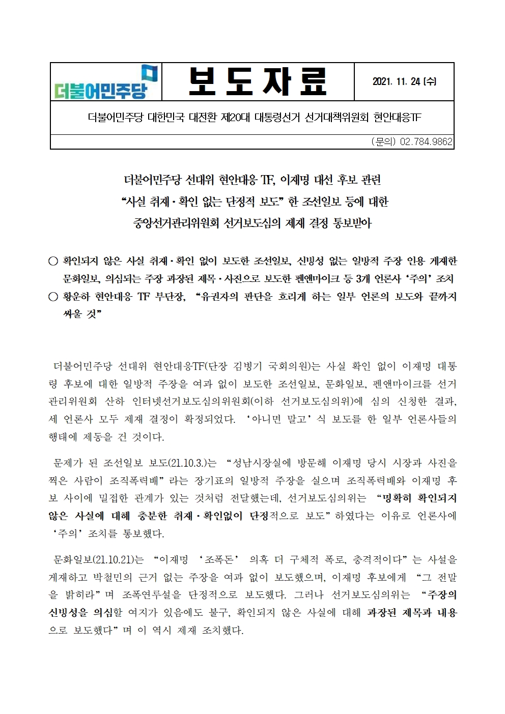 [보도자료] 더불어민주당 선대위 현안대응 TF, 이재명 대선 후보 관련 “사실 취재·확인 없는 단정적 보도”한 조선일보 등에 대한 중앙선거관리위원회 선거보도심의 제재 결정 통보