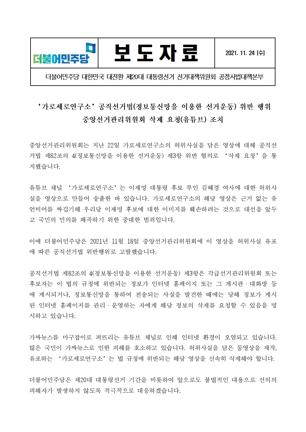 [보도자료] 더불어민주당 선대위 공정사법대책본부, '가로세로연구소'공직선거법 위반 행위 중앙선관위 삭제 요청 조치
