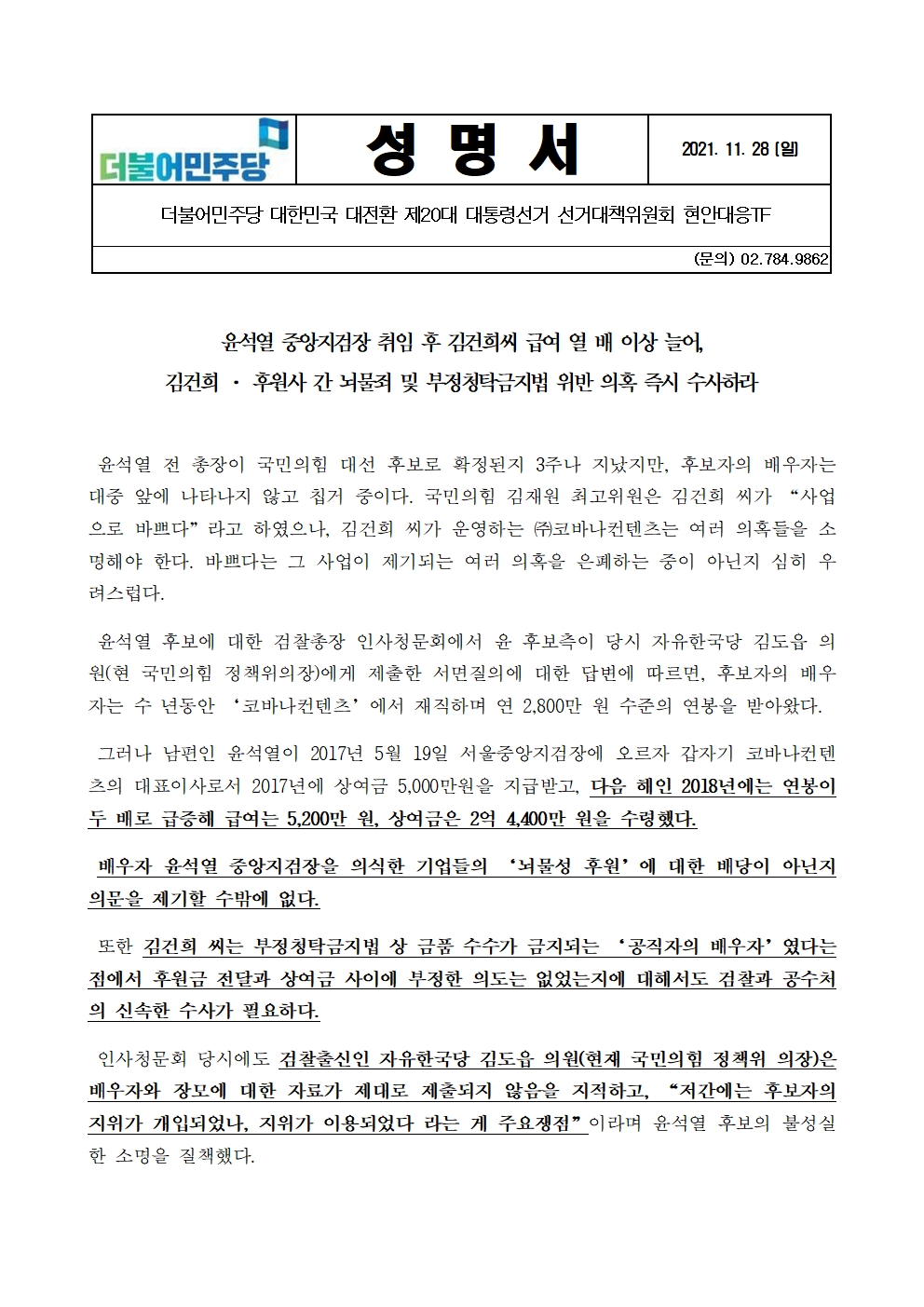 [보도자료] 윤석열 중앙지검장 취임 후 김건희 씨 급여 열 배 이상 늘어