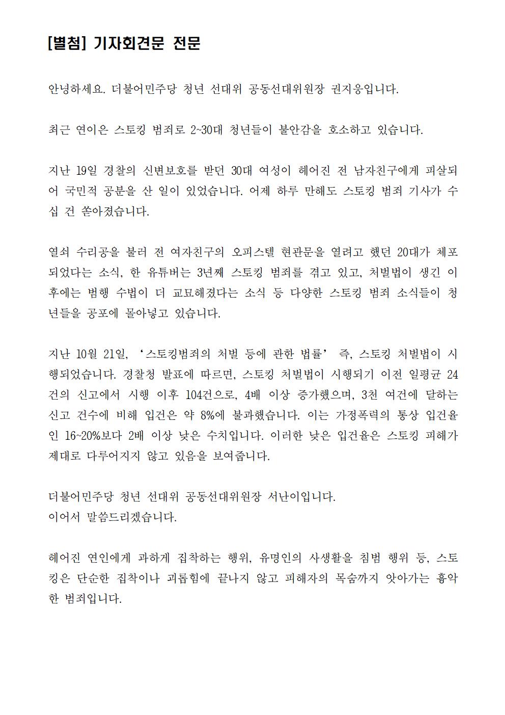 [보도자료] 더불어민주당 다이너마이트 청년 선대위 스토킹 범죄 대책 마련 요구 기자회견