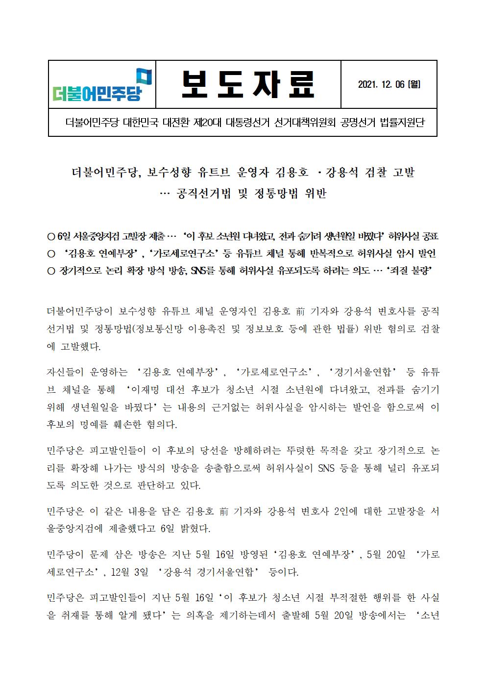[보도자료] 더불어민주당 선대위 법률지원단, 보수 유튜버 김용호 강용석 공직선거법 및 정통망법 위반 혐의 고발