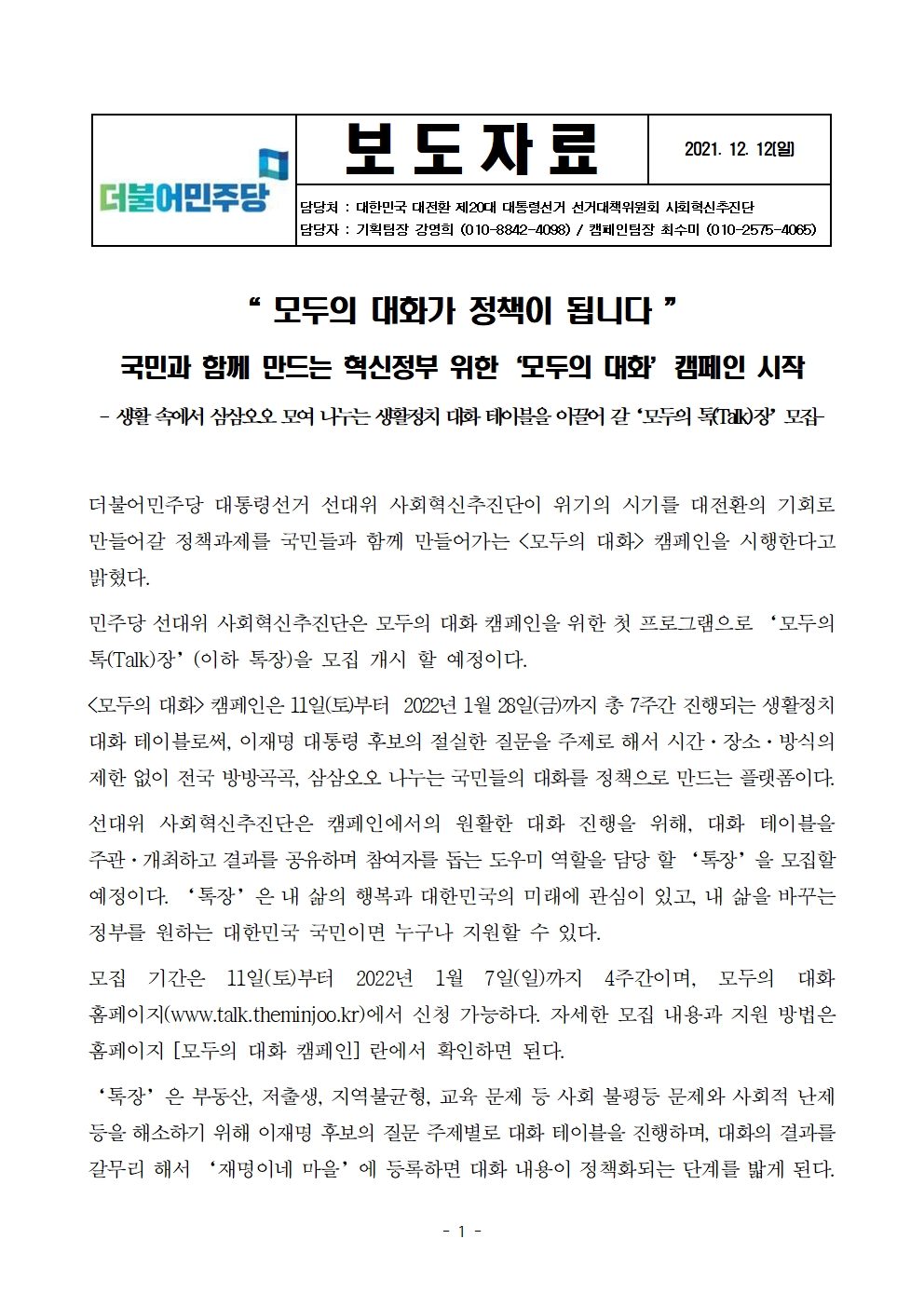 [보도자료] 더불어민주당 선대위 사회혁신추진단, '모두의 대화' 캠페인 시작, '모두의 톡(Talk)장’ 모집 개시