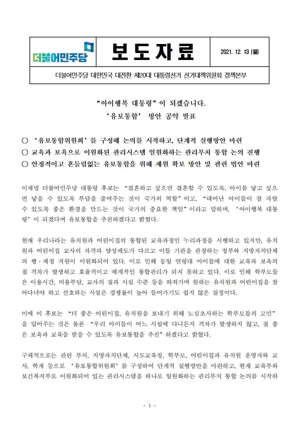 211213_더불어민주당_선대위_정책본부_유치원_보육시설_통합_공약_보도자료.pdf