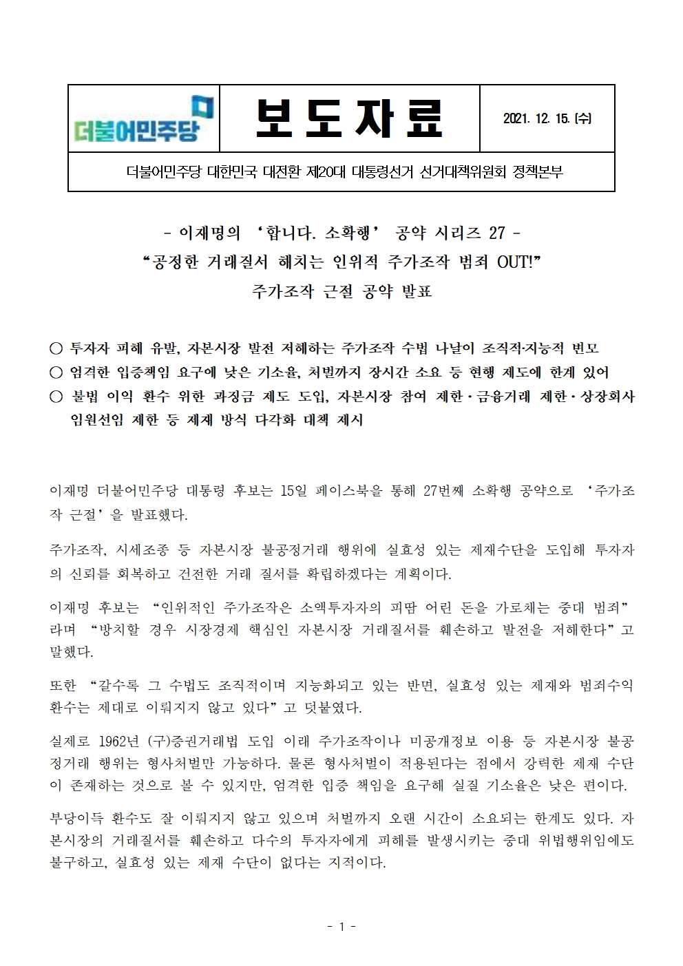 [보도자료] 더불어민주당 선대위 정책본부, '이재명의 합니다. 소확행 공약 시리즈 27' 주가조작 근절 공약 발표