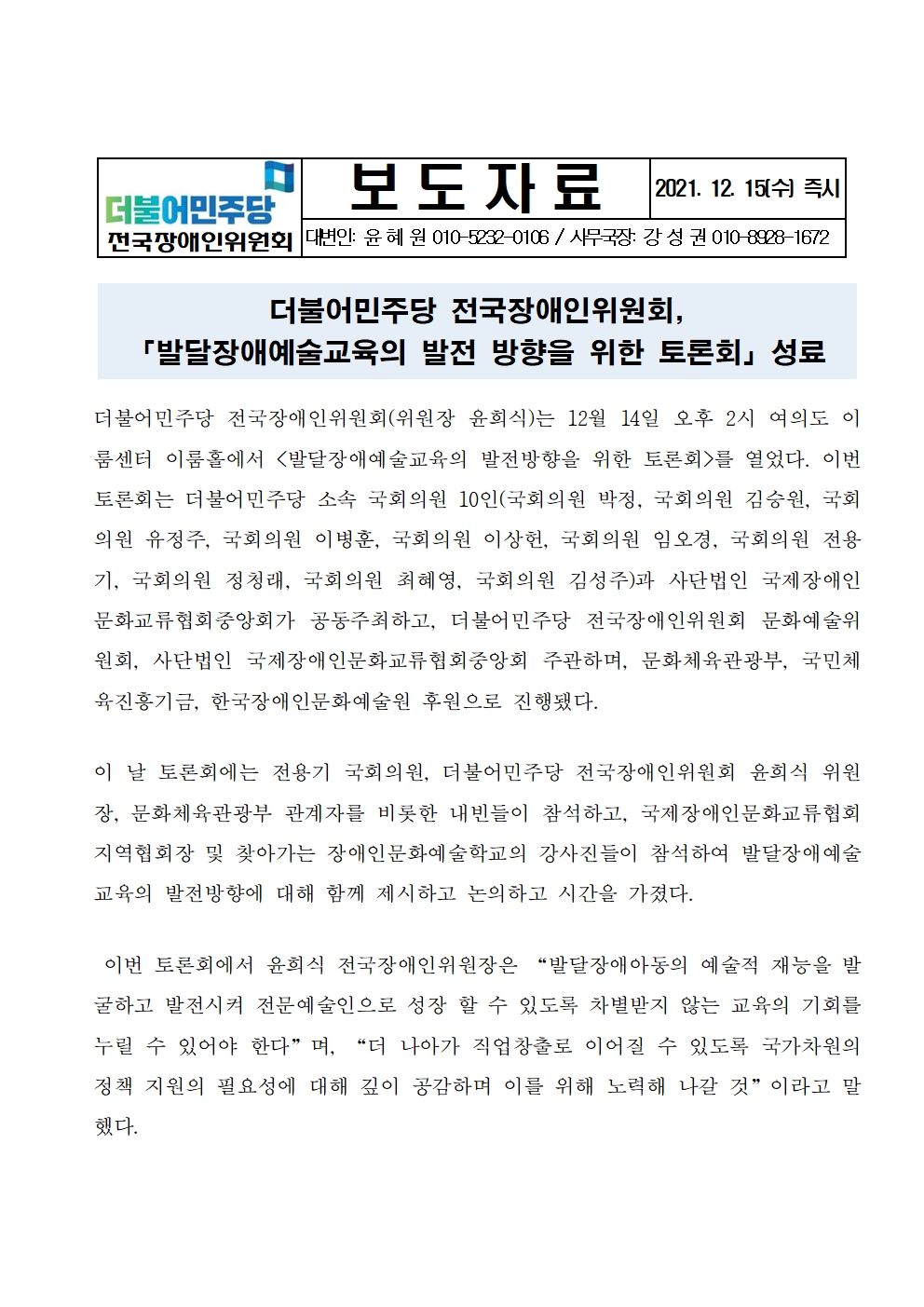 [보도자료] 더불어민주당 전국장애인위원회, 발달장애예술교육의 발전 방향을 위한 토론회 성료