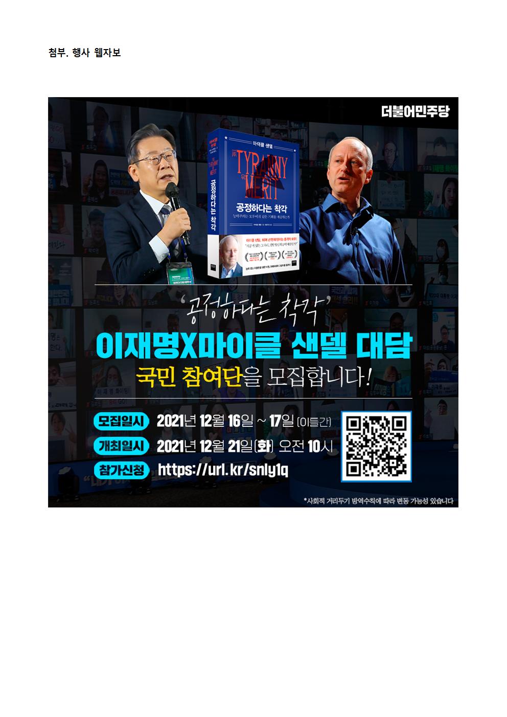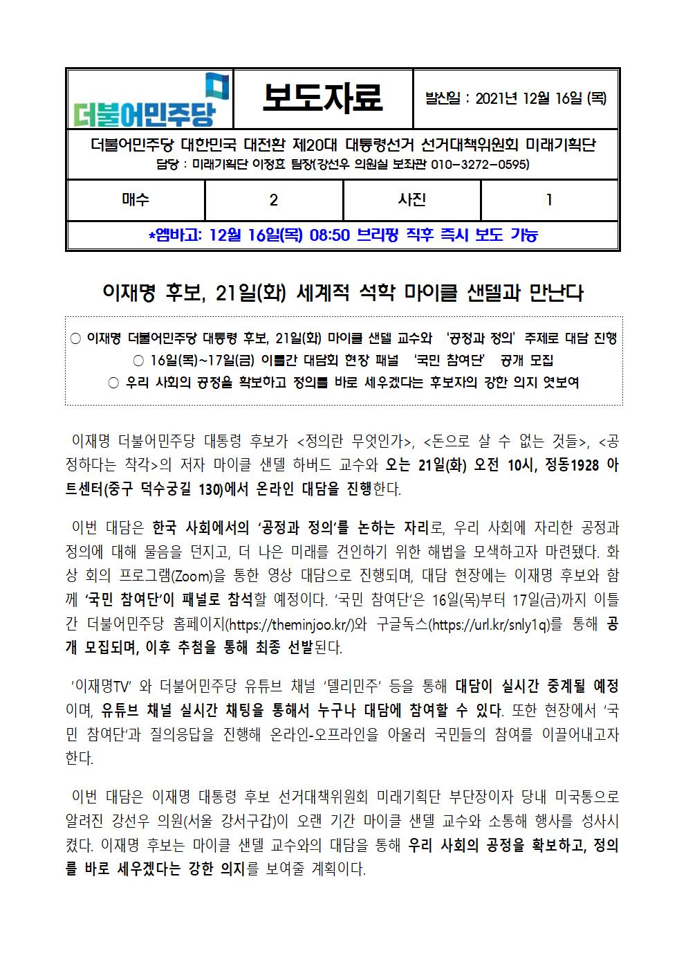 [보도자료]더불어민주당 선대위 미래기획단, 이재명 후보, 세계적 석학 마이클 샌델 만나다