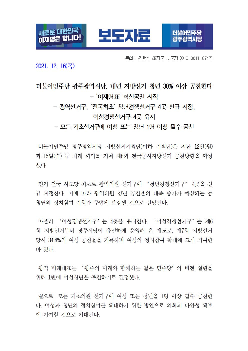 [보도자료] 더불어민주당 광주시당, 지방선거기획단 주요결정 사항