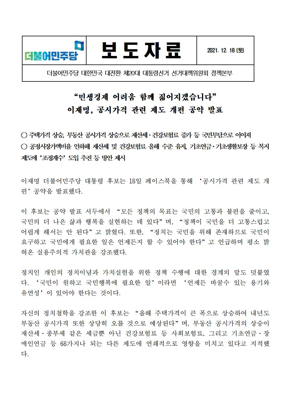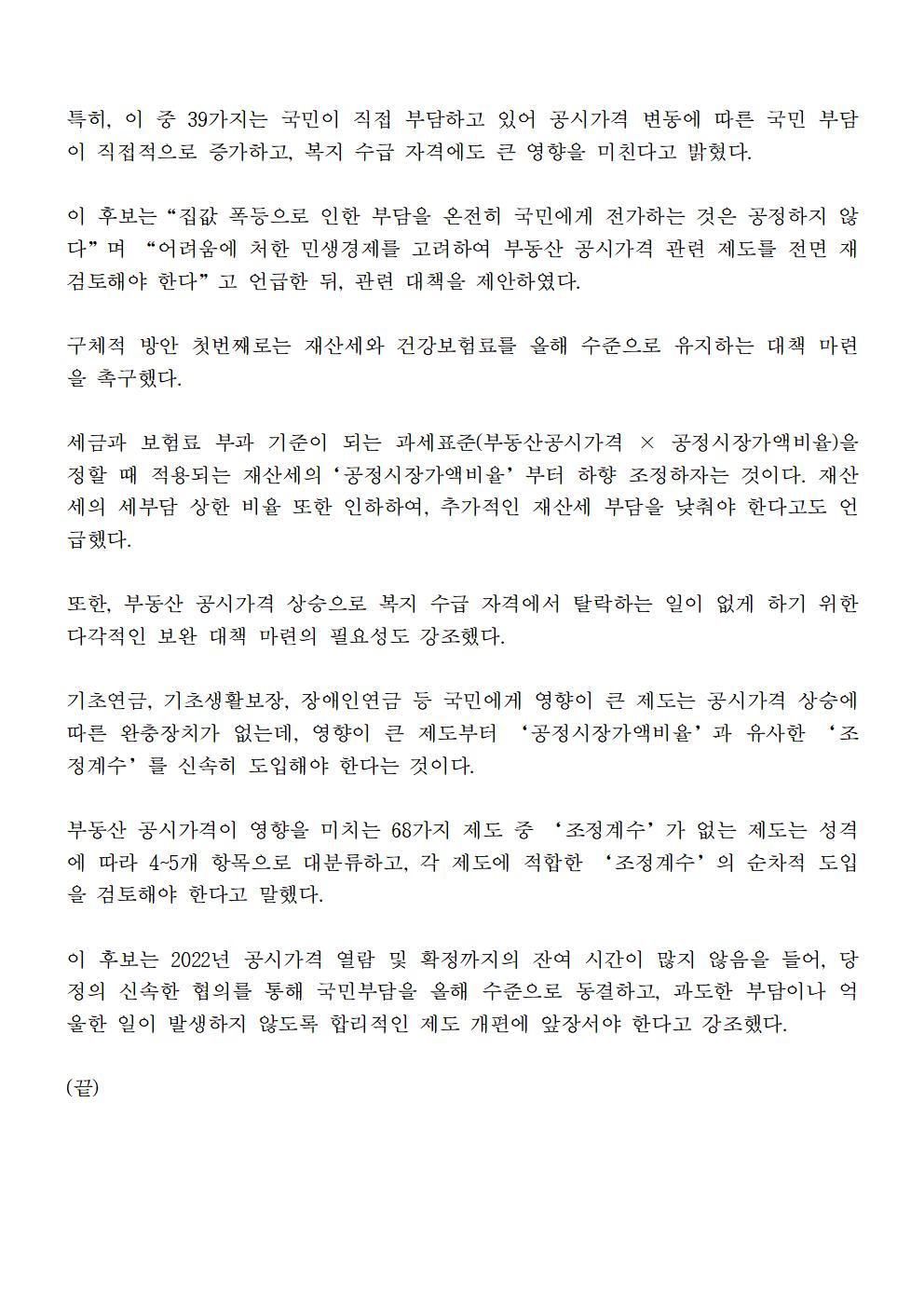 [보도자료] 더불어민주당 선대위 정책본부 공시가격 관련 제도 개편 공약