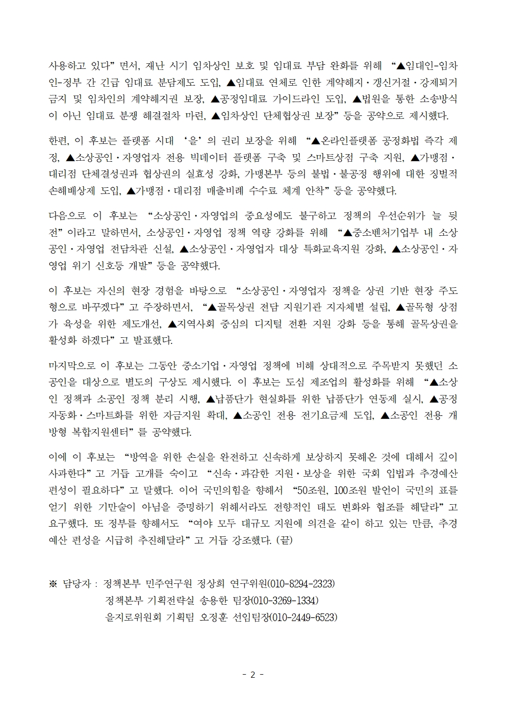 [보도자료] 더불어민주당 선대위 을지로위원회·정책본부, '소상공인·자영업 정책 공약' 발표