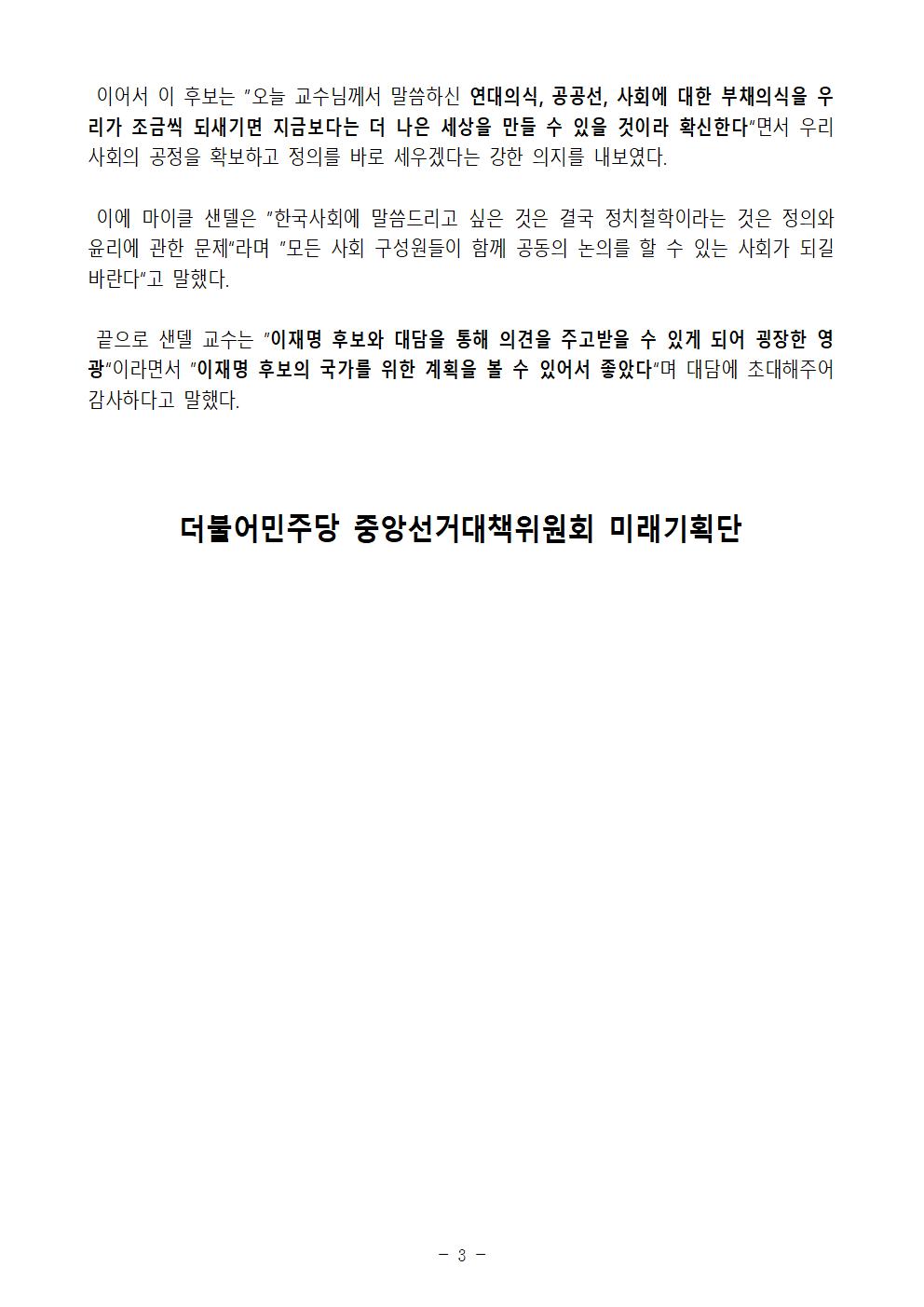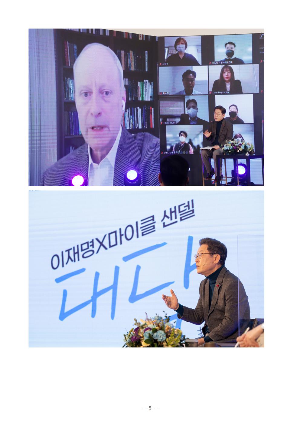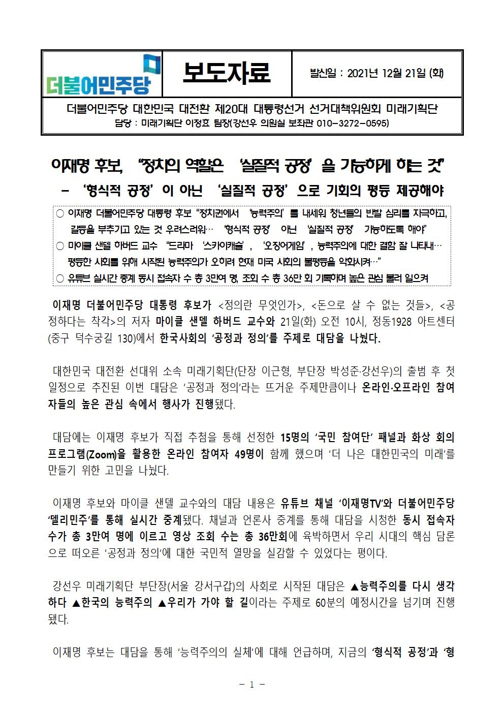 [보도자료] 더불어민주당 선대위 미래기획단 이재명 후보-마이클샌델 대담 정치의 역할은 실질적 공정을 가능하게 하는 것