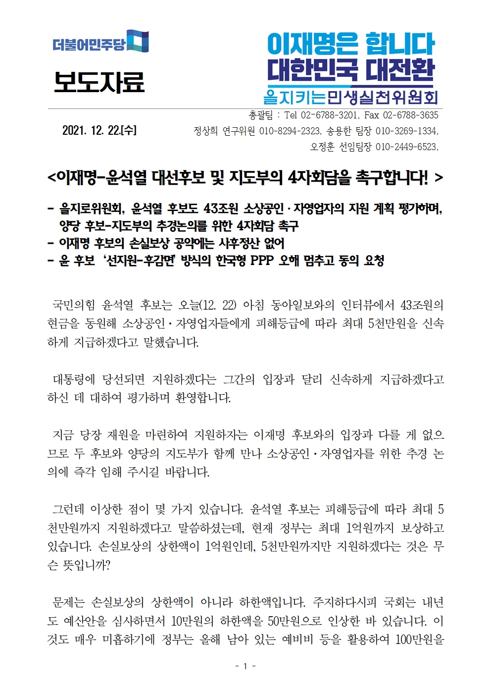 [보도자료] 더불어민주당 을지로위원회, 이재명-윤석열 대선후보 및 지도부의 4자회담을 촉구합니다!