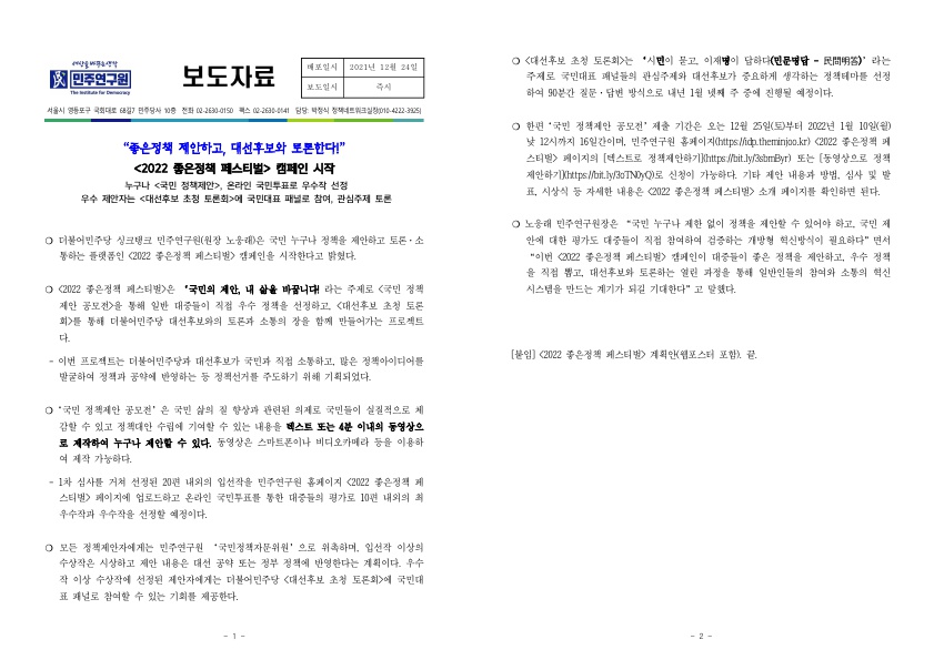 [보도자료] 더불어민주당 민주연구원, "좋은정책 제안하고, 대선후보와 토론한다!" 2022 좋은정책 페스티벌
