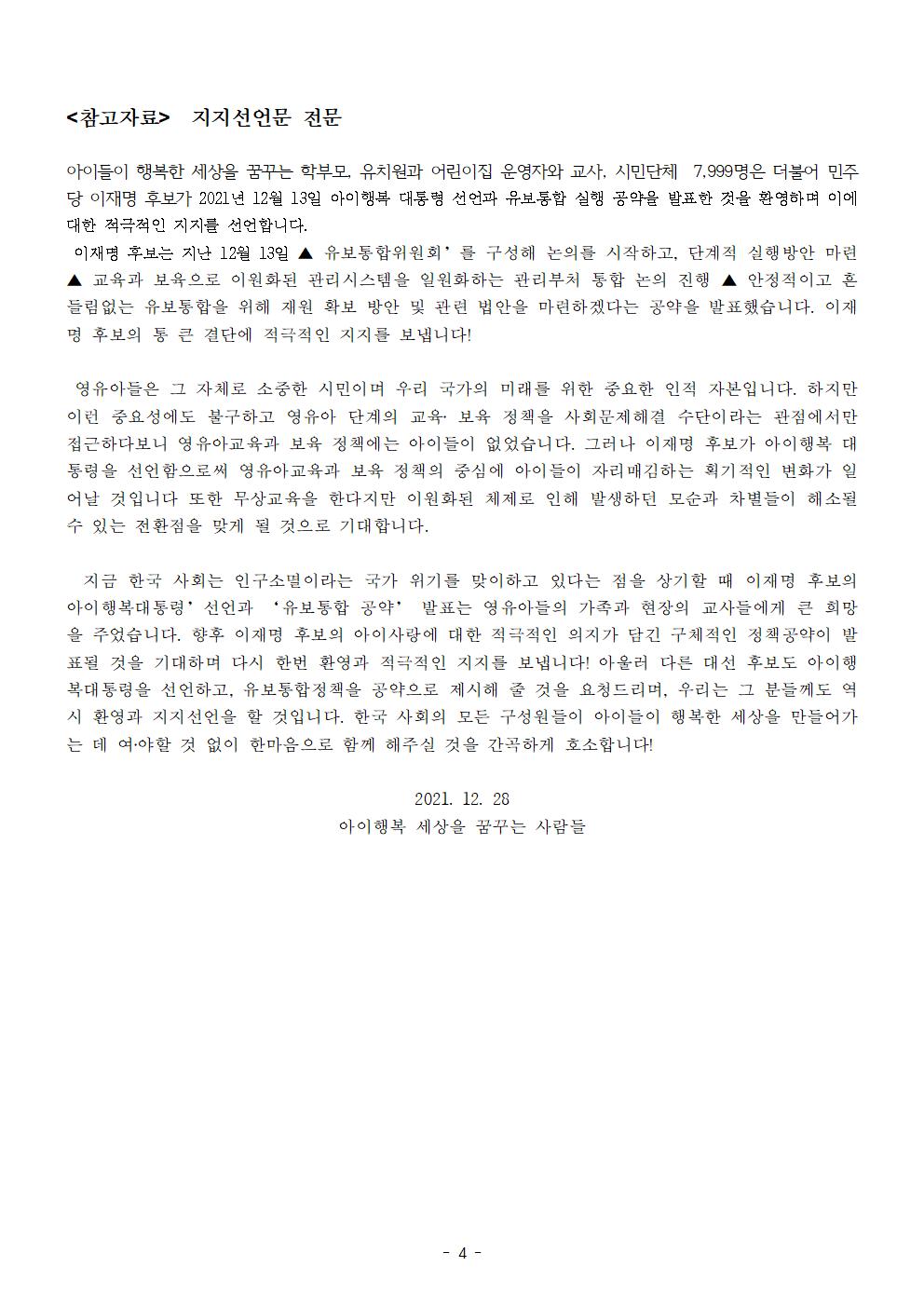 [보도자료] 더불어민주당 선대위 직능본부 이재명 후보 유보통합 공약 지지선언