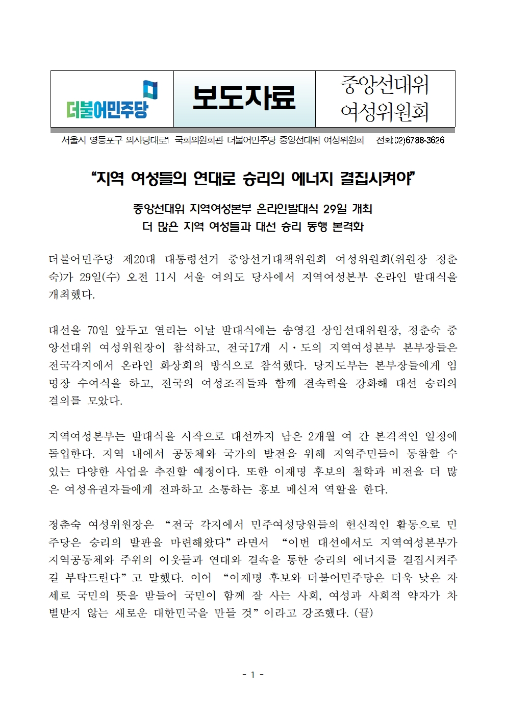 [보도자료] 더불어민주당 선대위 여성위원회, 지역여성본부 온라인 발대식 개최