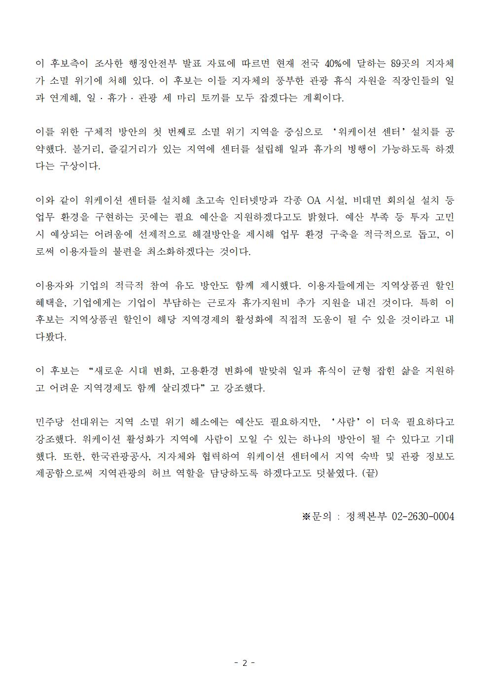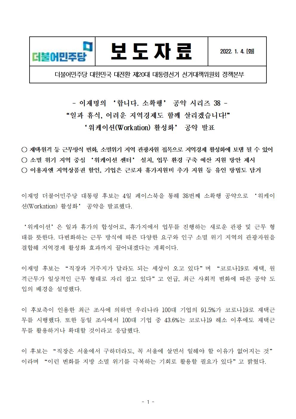[보도자료] 더불어민주당 선대위 정책본부, '이재명은 합니다. 소확행 공약 시리즈 38' 워케이션 활성화 공약