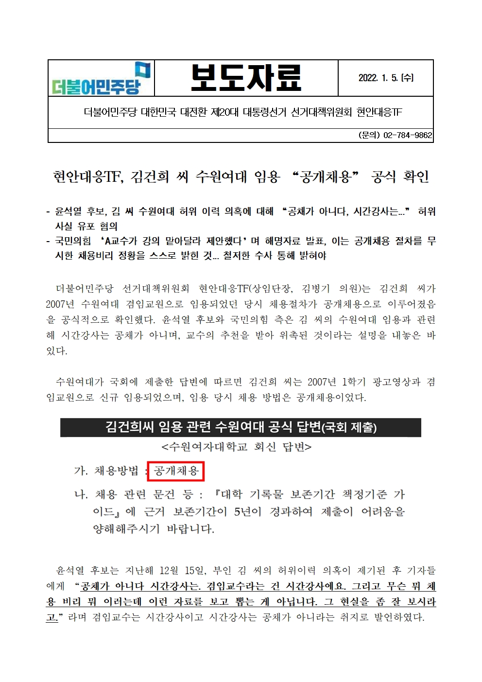 [보도자료] 더불어민주당 선대위 현안대응TF, 김건희 씨 수원여대 임용 공개채용 공식 확인