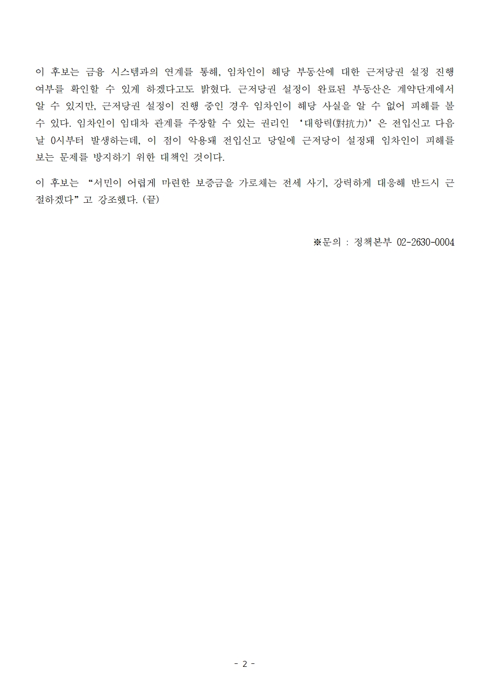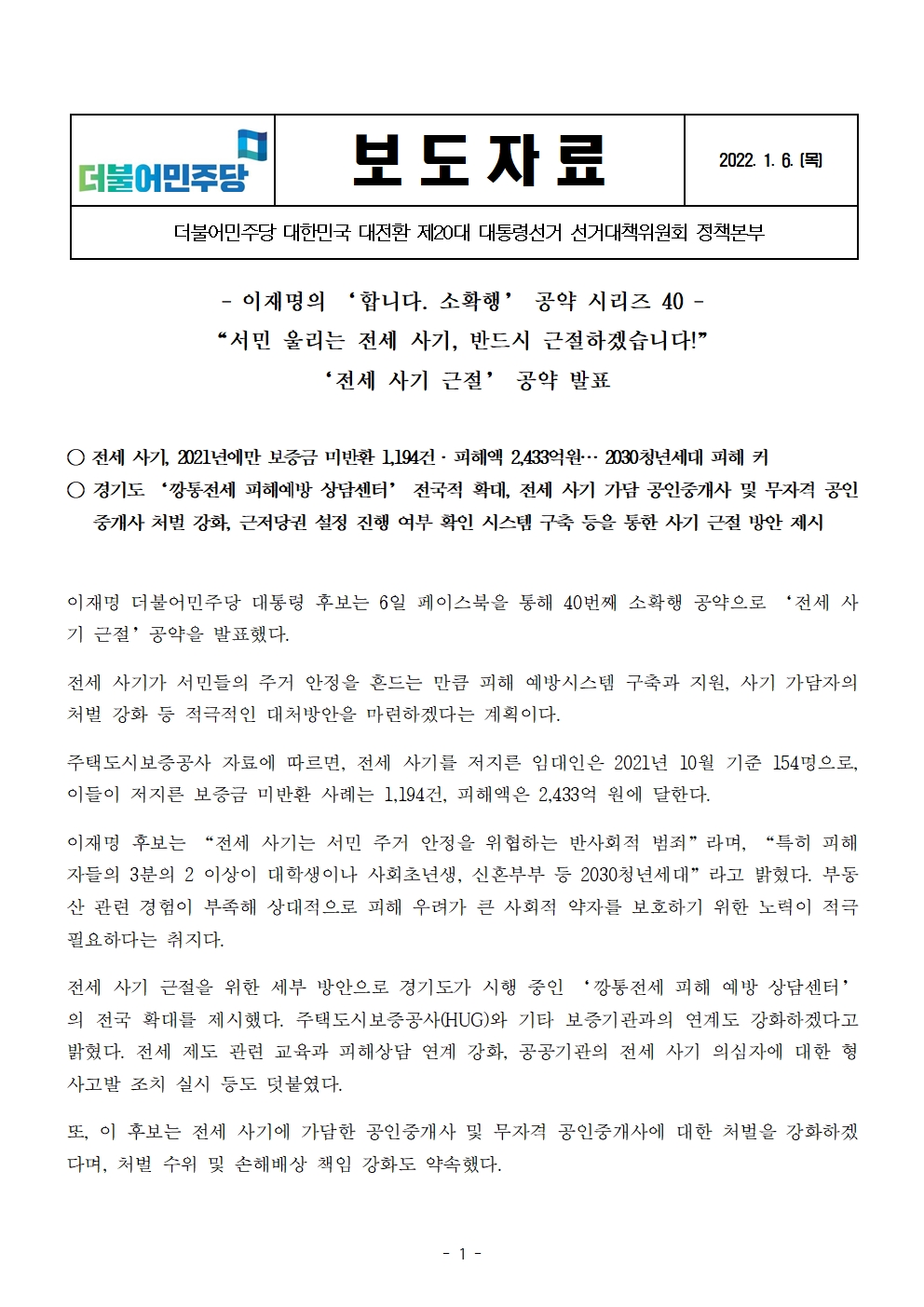 [보도자료] 더불어민주당 선대위 정책본부, '이재명은 합니다. 소확행 공약 시리즈 40' 전세 사기 근절 공약
