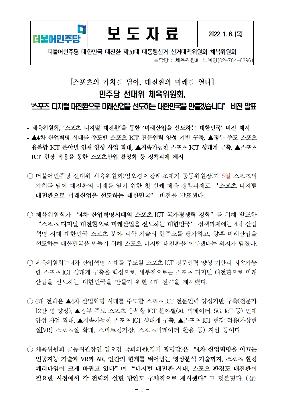 [보도자료] 더불어민주당 선대위 체육위원회, 스포츠 디지털 대전환 비전 발표