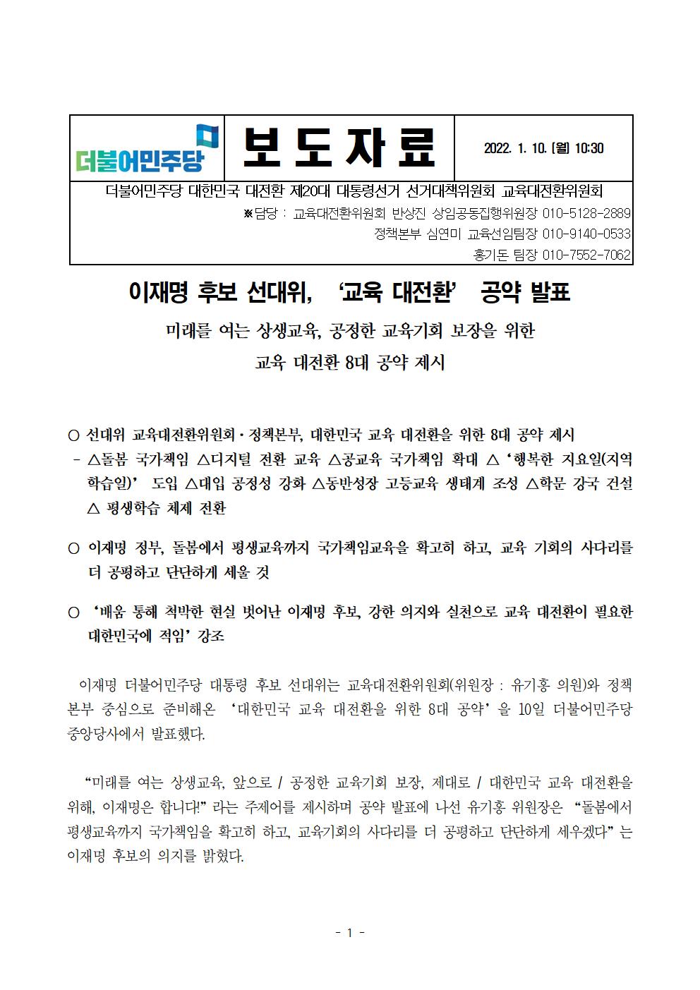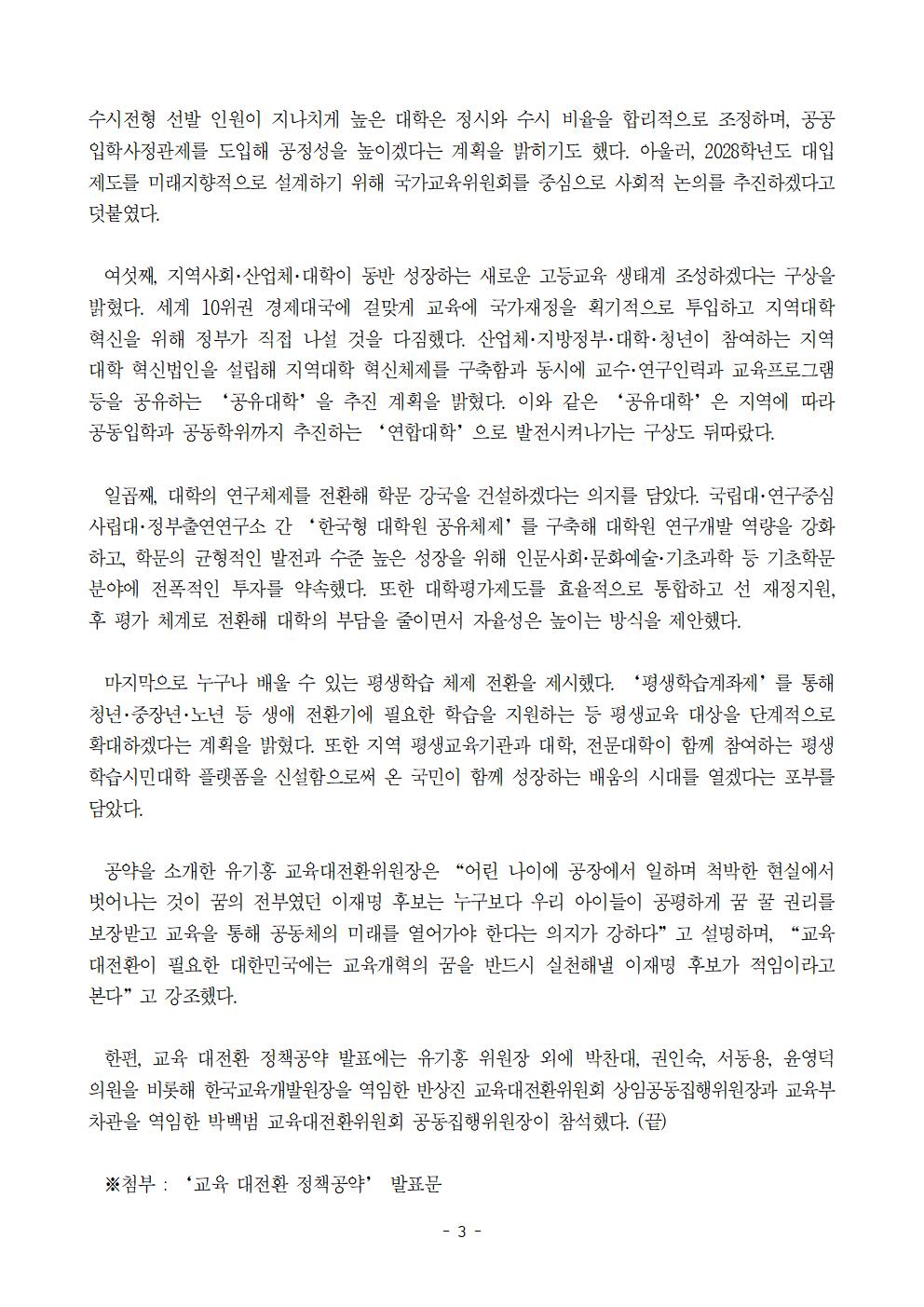 [보도자료] 더불어민주당 선대위 교육대전환위원회 공약발표