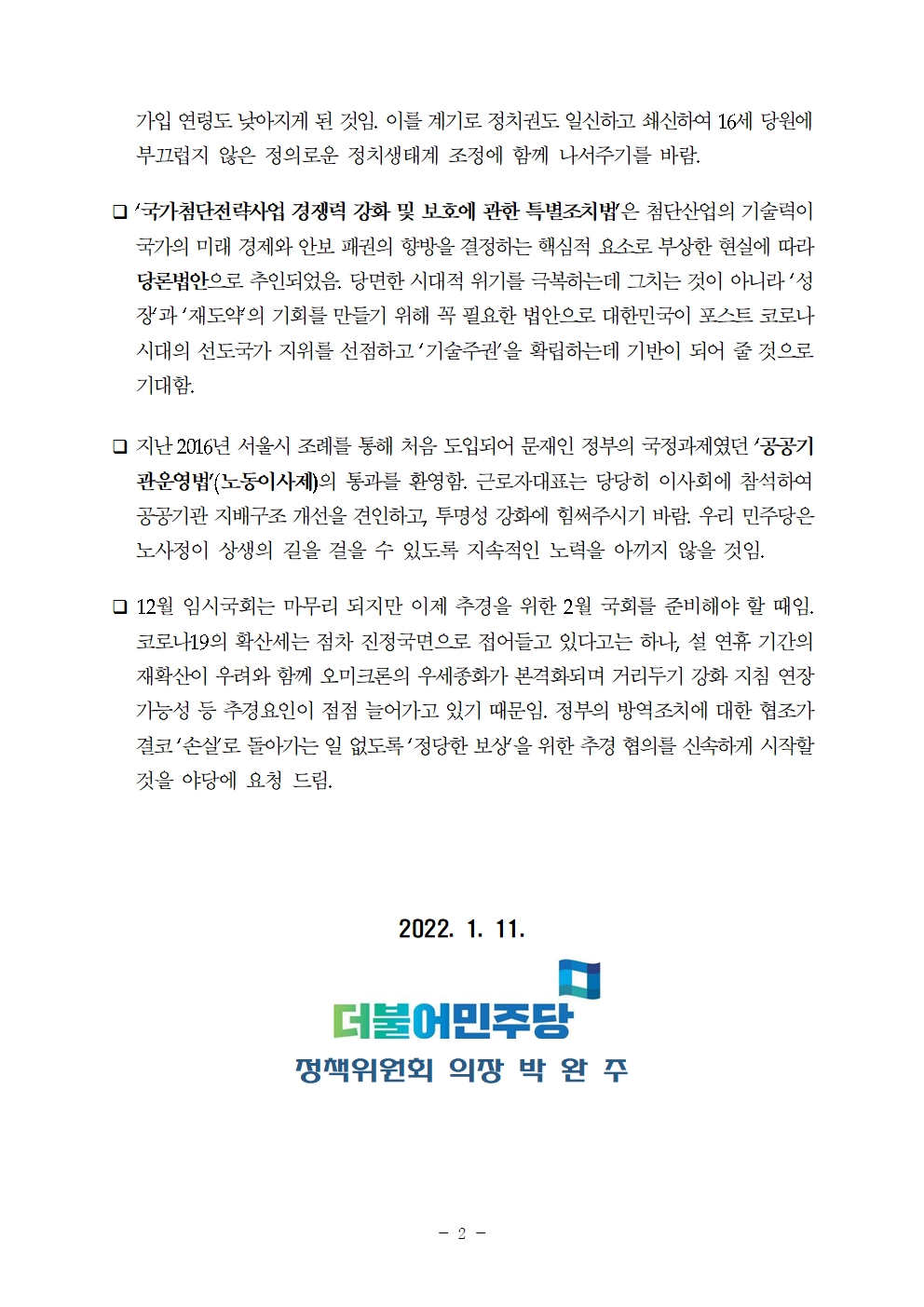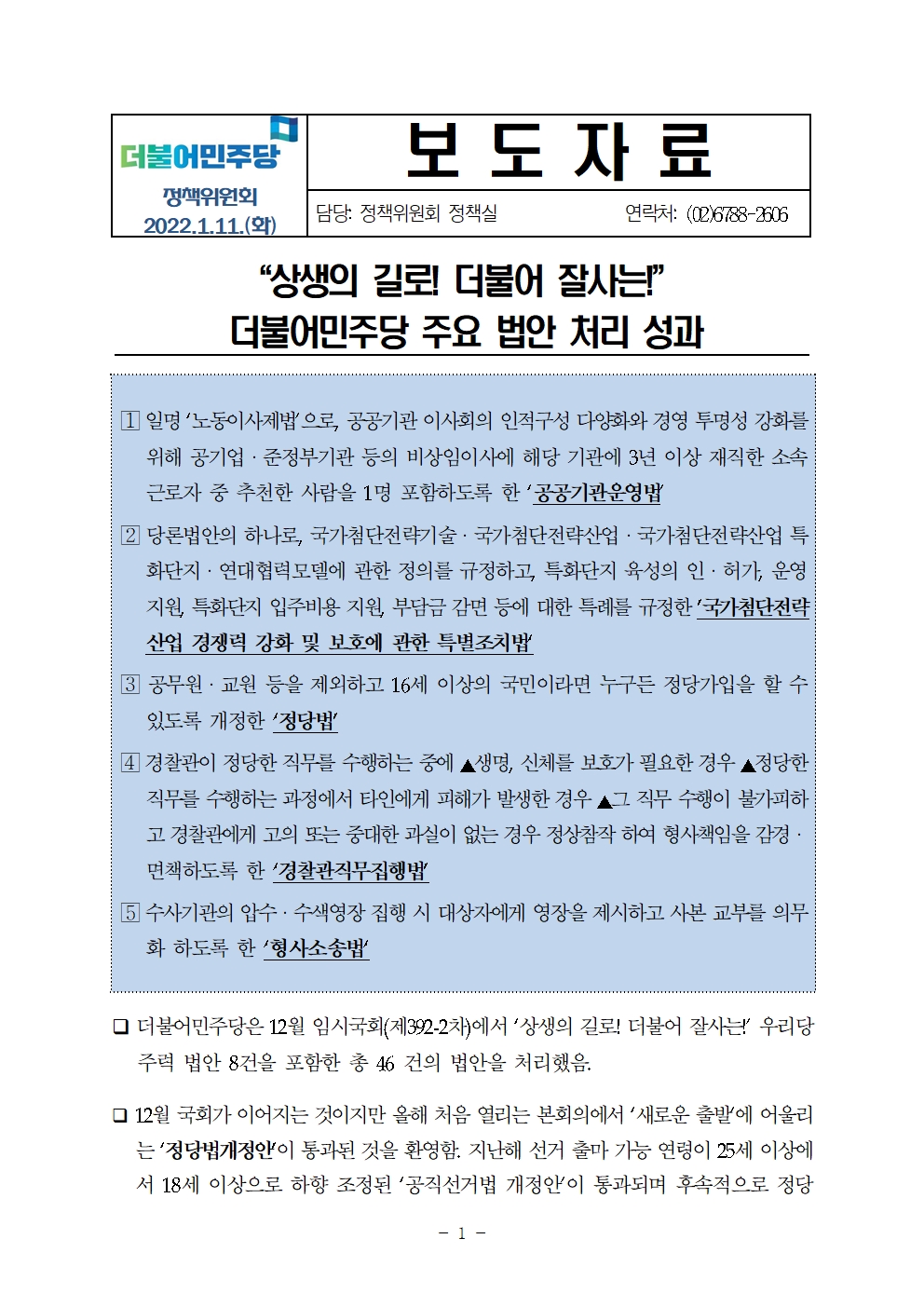 [보도자료] 더불어민주당 정책위원회, 주요 법안 처리 성과