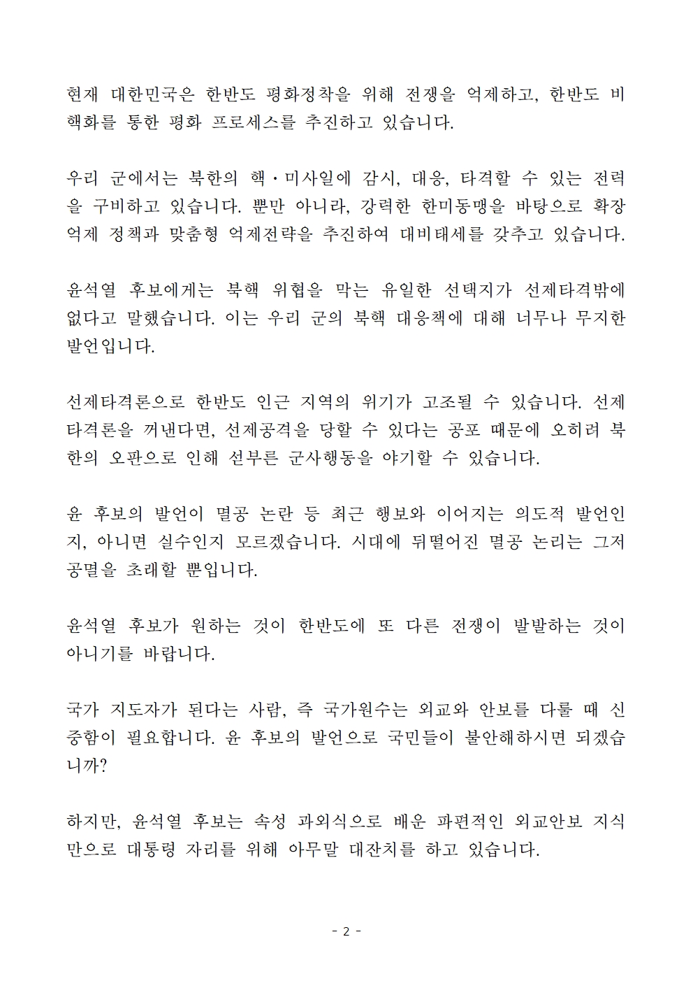 [성명서] 더불어민주당 선대위 평화번영위원회, 현안 관련 입장 발표