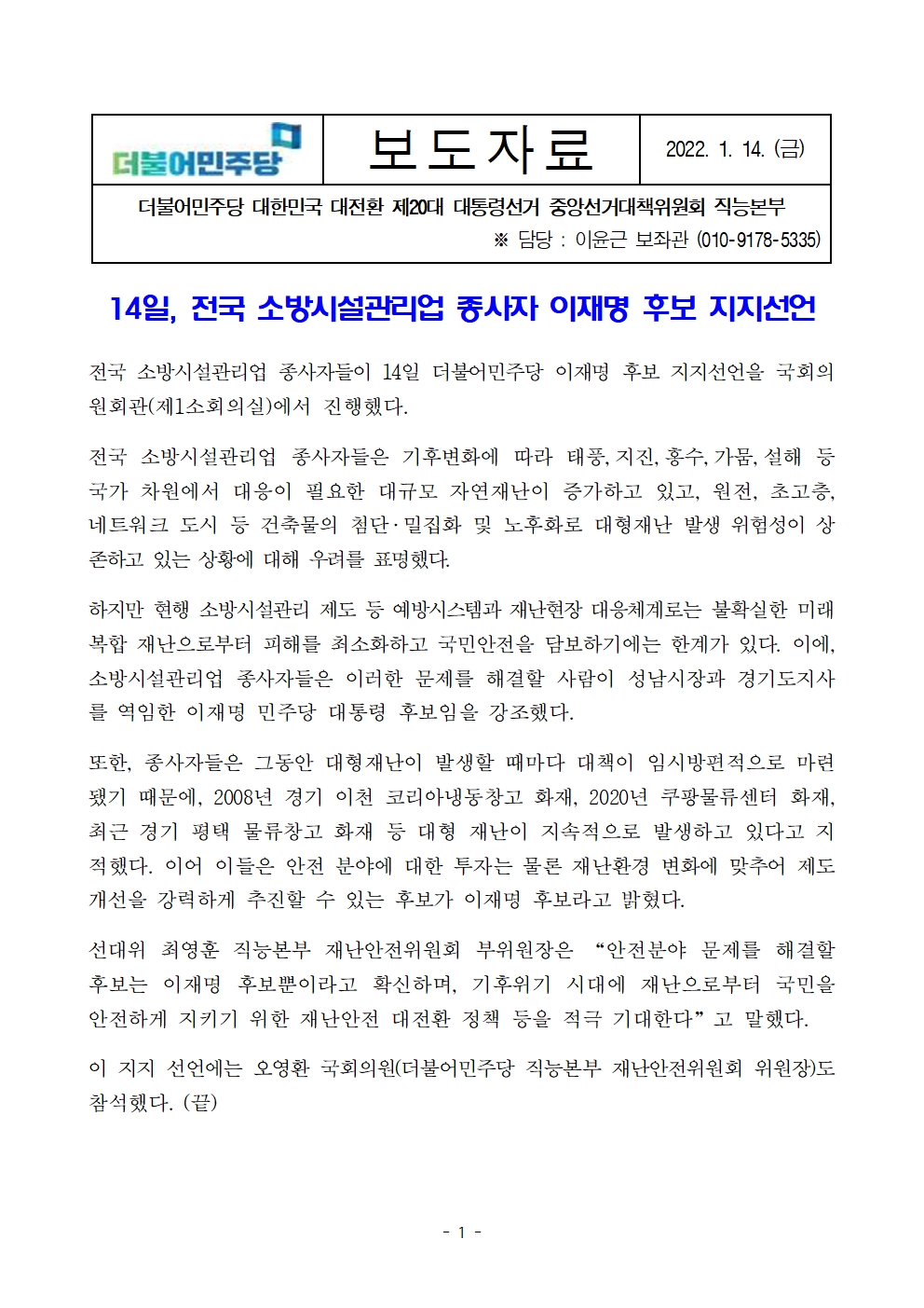 [보도자료] 더불어민주당 선대위 직능본부, 대전 및 자동차진단, 소방시설관리 직능단체 지지선언