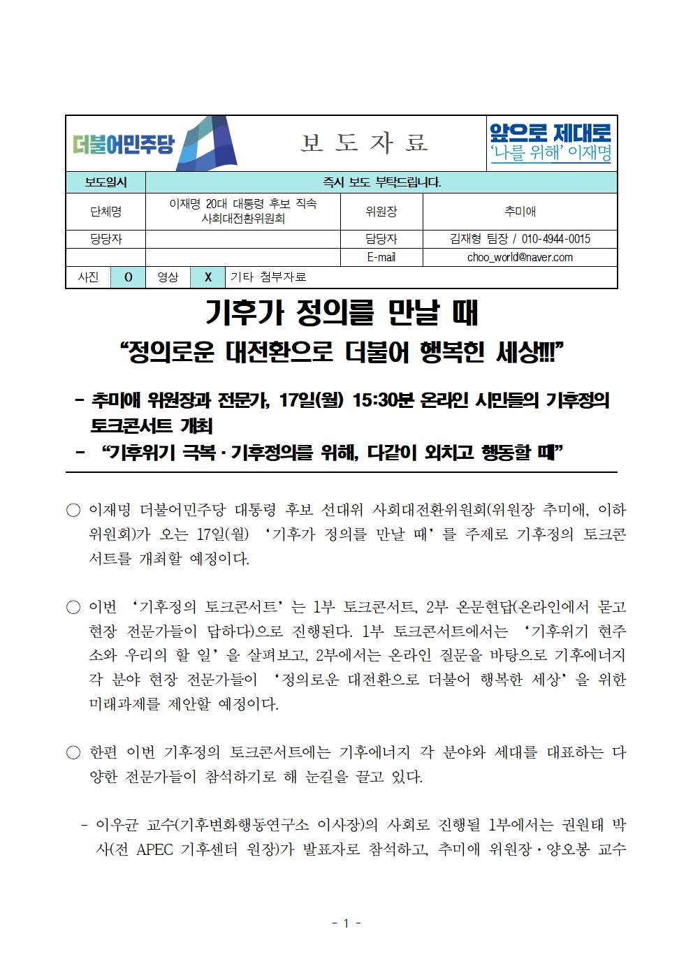 [보도자료] 더불어민주당 선대위 사회대전환위원회, 기후정의 콘서트 개최