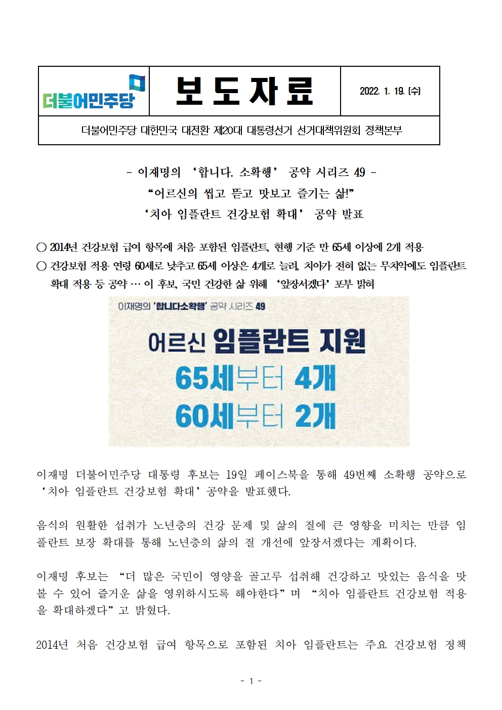 [보도자료] 더불어민주당 선대위 정책본부, '이재명은 합니다. 소확행 공약 시리즈 49' 치아 임플란트 건강보험 확대 공약