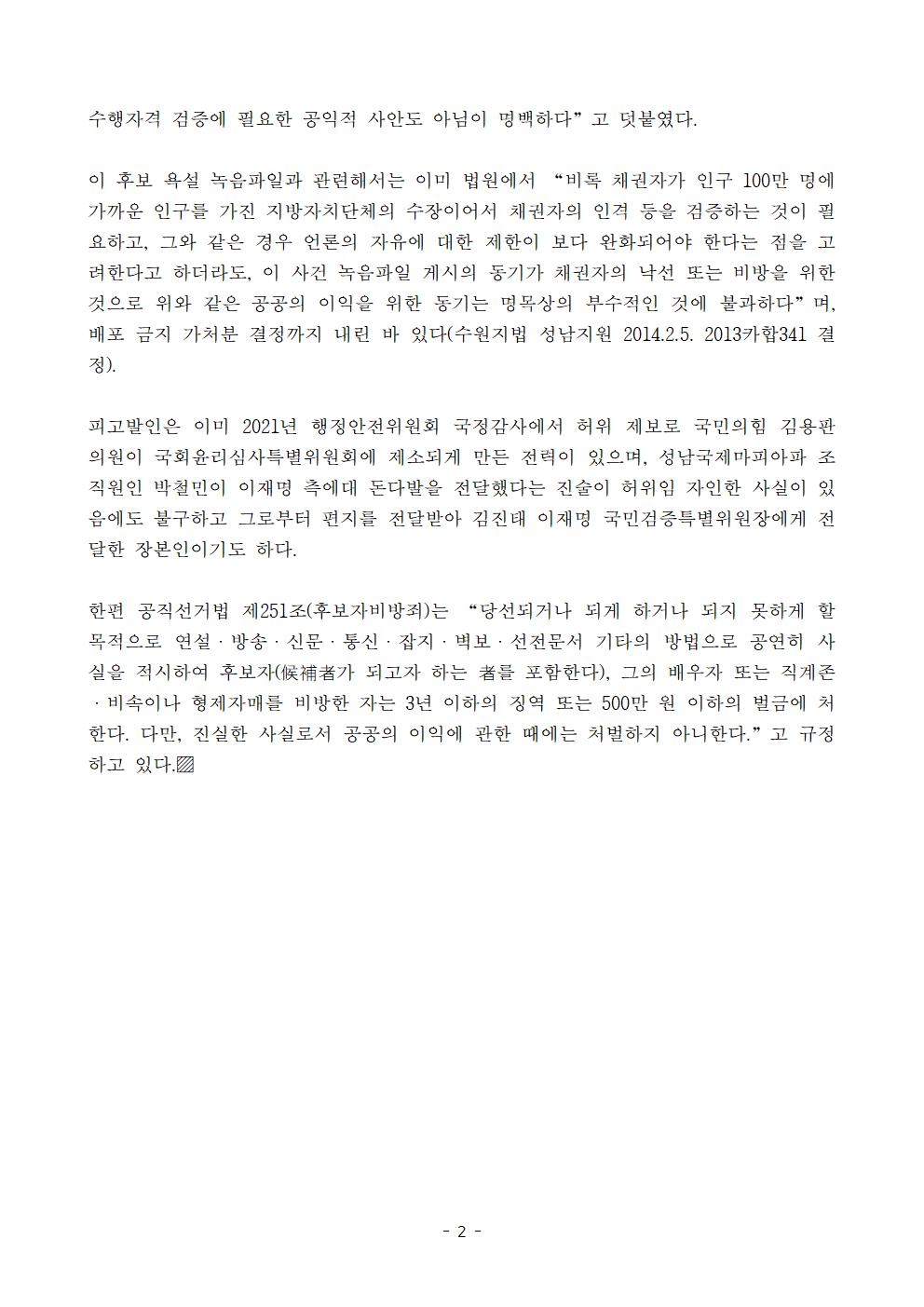 [보도자료] 더불어민주당 선대위 국민검증법률지원단 장영하 국민의힘 특위 위원 후보자비방죄 검찰 고발